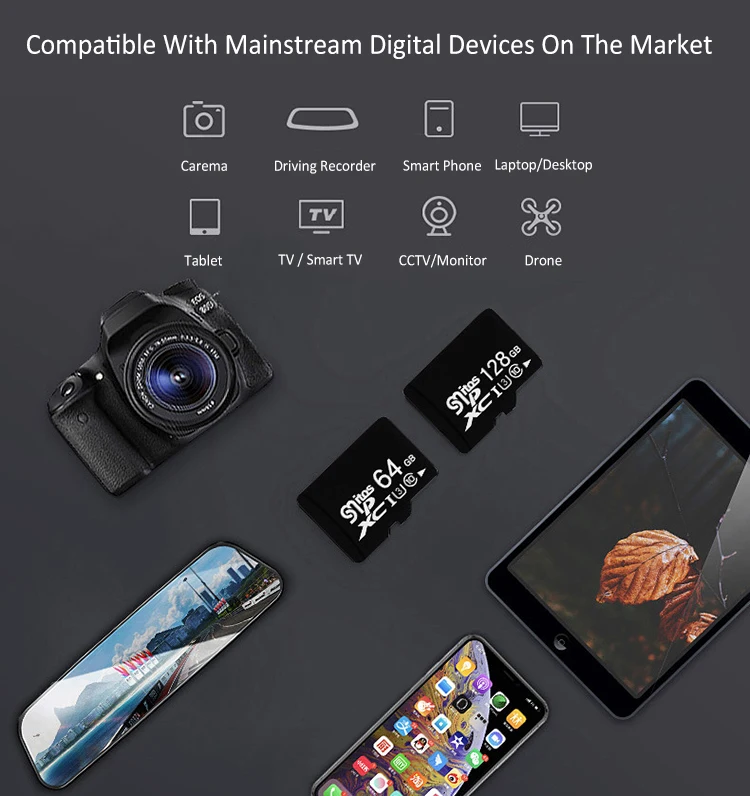 Цифровые Карты памяти могут быть использованы для: спортивных камер, навигации, вождения регистраторов, камер, мобильных телефонов, PSP игровых консолей, карточных динамиков, mp3, MP4, усилителей, SLRs и других цифровых продуктов, до тех пор, пока устройства, которые могут быть использованы для карт памяти, идеально совместимы.