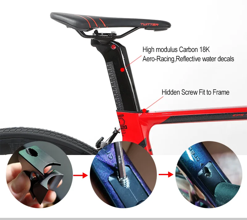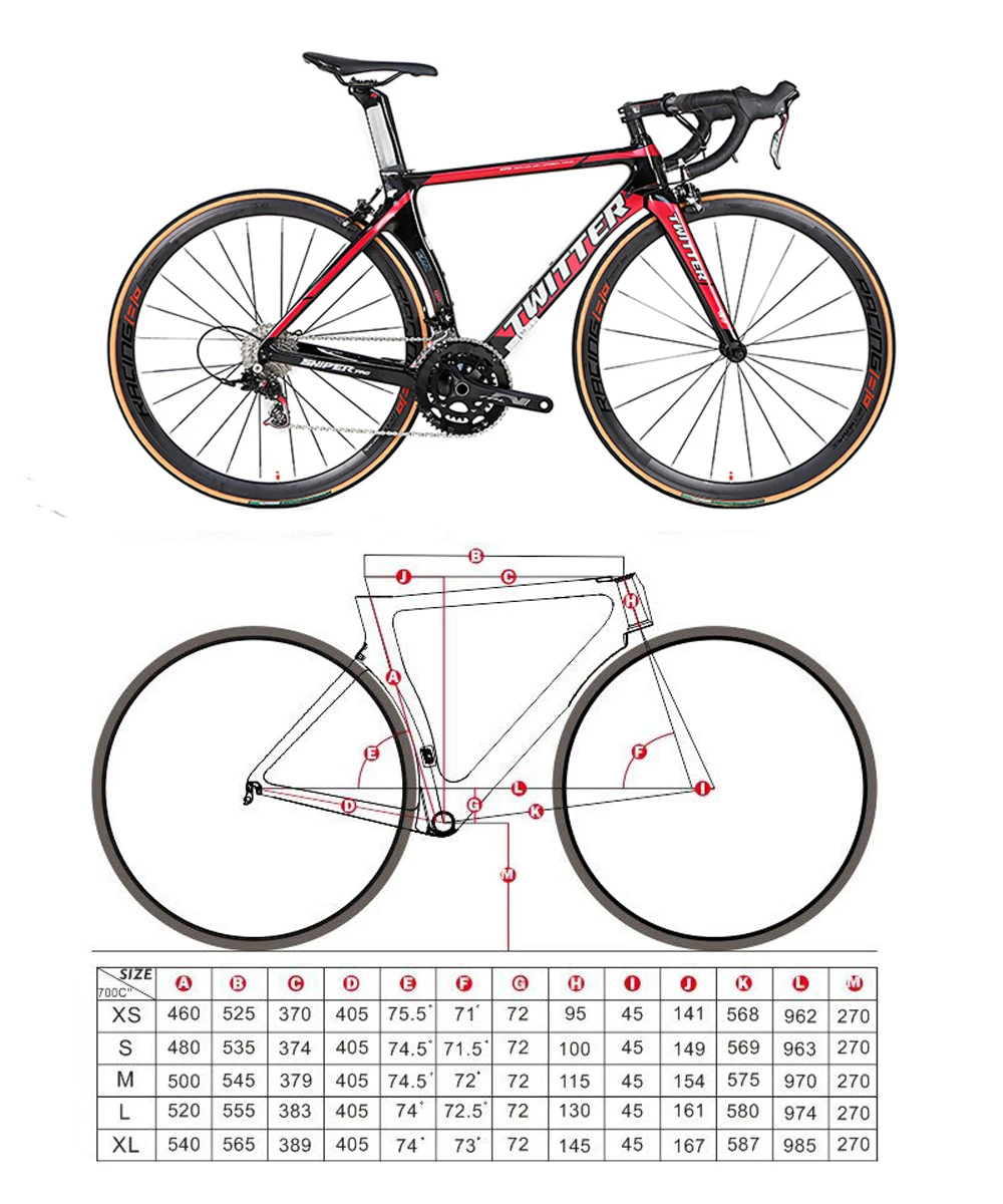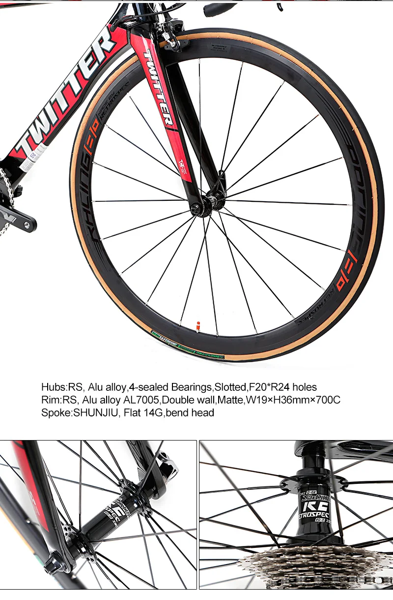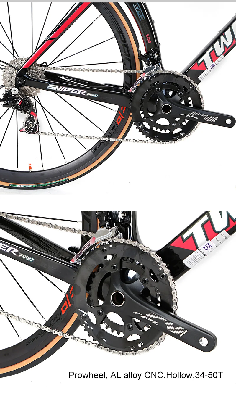 Bike Model : SNIPER2.0 Wheel Size : 700CFrame Size :46CM/48CM/50CM/52CM/54CMBike Weight :9.2kgFrame: high modulus Carbon 18K,EPS,Aero-Racing,Inner-Cable,Glittering&Bright,UV laser colorful&reflective decalsHandlebar set : TW, Aluminum alloy,Matte&water decals,oblate handlebar 31.8×420,Stem 90mm Superlight Alloy,Matte,,Carbon Seat Post 18KBike Fork : SNIPER2.0, high modulus Carbon 18K, 700C, UV laser colorful&reflective decalsDerailleur lever : RETROSPEC(SENSAH)-22Speed or 24SpeedFront Derailleur : RETROSPEC(SENSAH)Rear Derailleur : RETROSPEC(SENSAH)Crank set : prowheel RPL, AL alloy Hollow,34-50TCassette :22 Speed SUGEK-11Speed,11-28T or 24 Speed SUNSHINE-12Speed 11-30TChain : 22 Speed YBN-11 Speed, 24Speed SUMC-12 SpeedBrake : RS Aluminum alloy Hollow Caliper brakeHub : RS, Aluminum alloy ,4-sealed Bearings,Slotted,F18*R21 holes,UV laser colorful decalsRim : RS, Aluminum alloy AL7005,Double wall,Matte,W23×H36mm×700CTire : INNOVA-PRO,Smoothie, 700C×25CGrip : Woven&Comfortable&Skid resistantSaddle : TW, comfortable&lightweight for racingPedals : SENCE, Alu alloy with Lightweight&Skid resistant