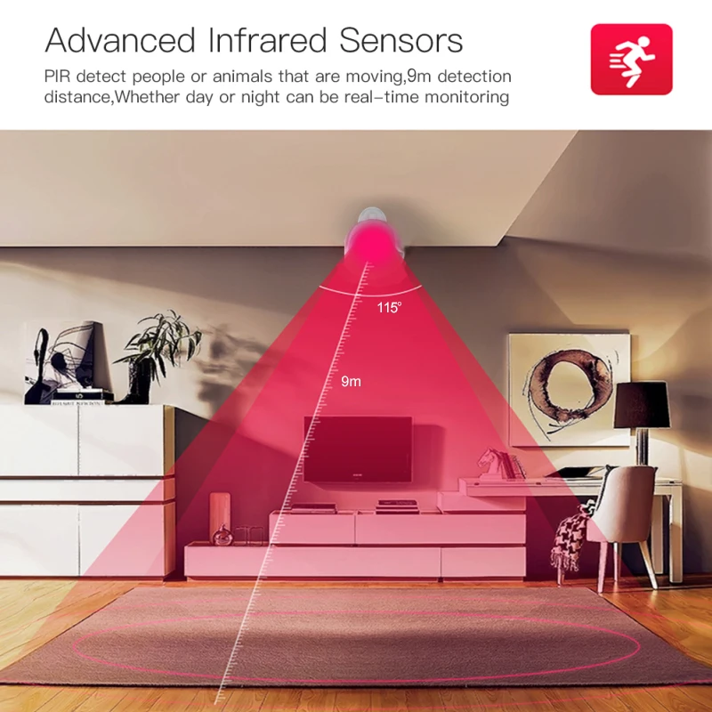 Главным компонентом Интеллектуального датчика движения является инфракрасный датчик (PIR senson), который способствует сотрудничеству оптической системы для обнаружения теплового излучения в определенной области. Когда кто-то перемещается в зону обнаружения, инфракрасное тепловое излучение детектора изменится.