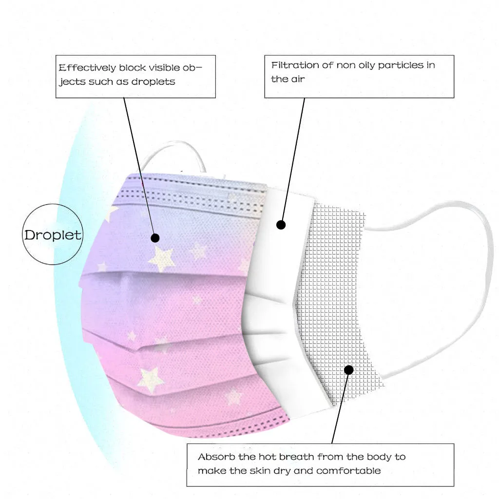 В 3 слоя Нетканая одноразовая маска изготовлена из 3 слоев нетканого материала, Безопасен и безопасен для использования. Дышащий материал и милый Узоры, которые делают его полезным и модным. Специальный 3 слоя из нетканого материала Дизайн, обеспечивает некоторую защиту от пыли, автомобильных выхлопных газов, Пыльца и т. д. эластичная Ушная петля, легко носить и не давит на уши. Маникюрный салон или любые другие области, где может потребоваться защита