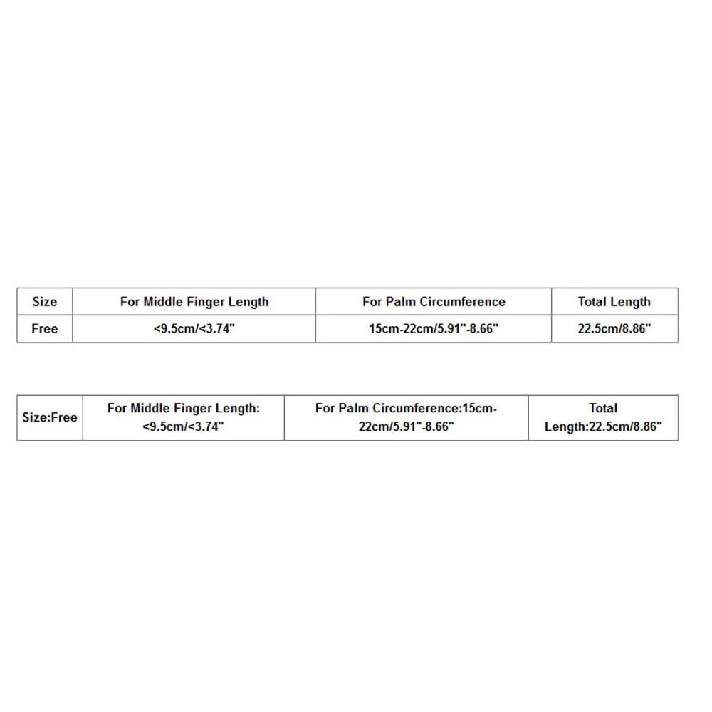 1 пара перчатокРазмер Для средней длины пальца Для окружности ладони Общая длина Бесплатно <9,5 см/<3,74 дюйма 15 см-22 см/5,91 дюйма-8,66 дюйма 22,5 см/8,86 дюйма