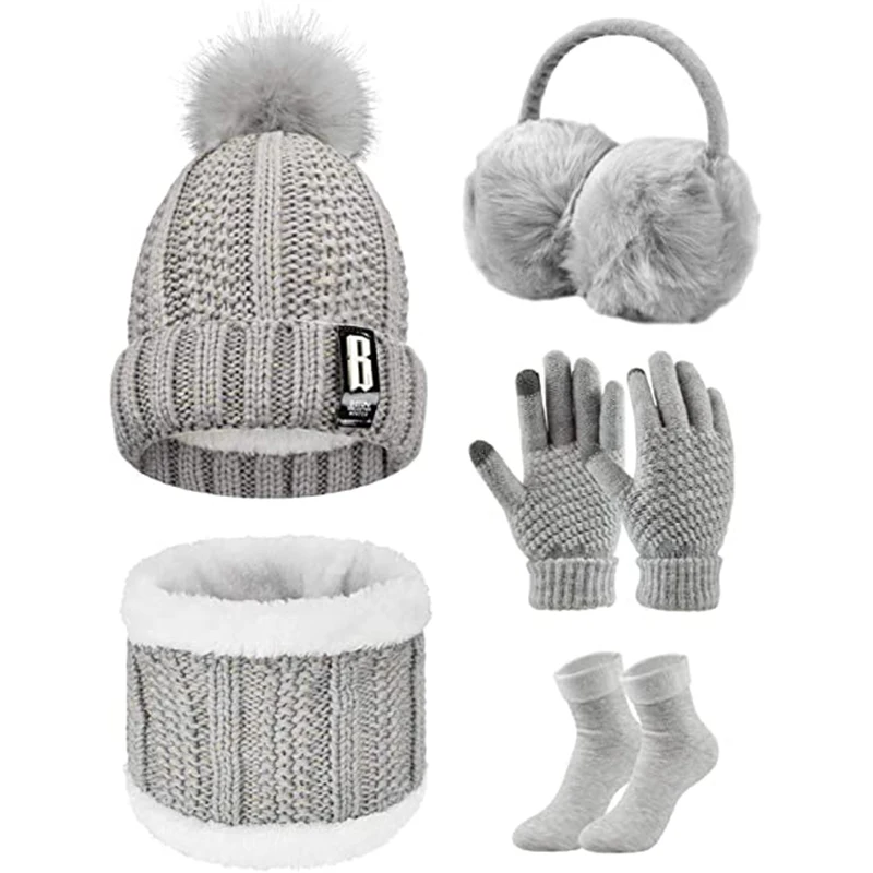 5. Зимний комплект из пяти предметов-в этот зимний комплект входят вязаная шерстяная шапка и шарф, теплые наушники, теплые перчатки для сенсорного экрана и пара хлопковых снежных носков. Держать их в тепле, пока вы все вокруг вашего тела в одежда для холодной зимы.