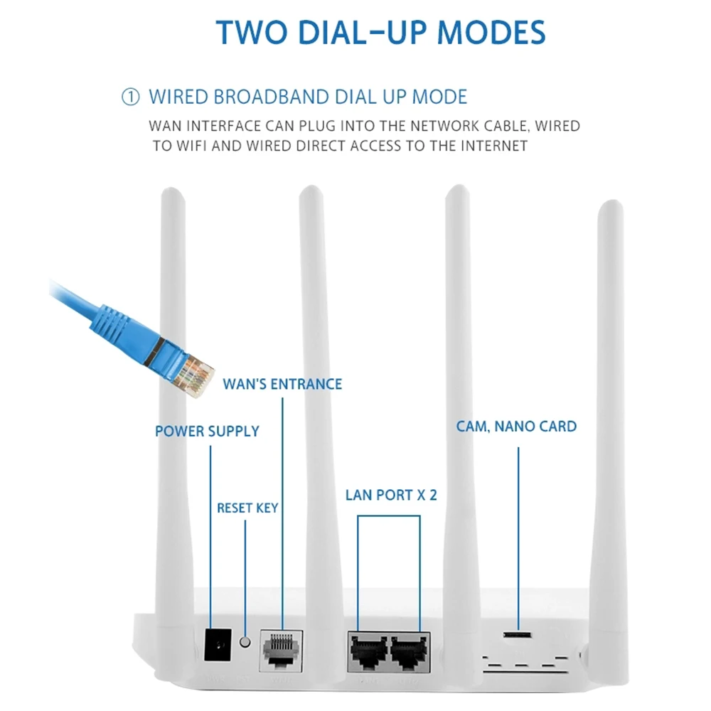 WE2805-A принимает программу MT7628DA, основная частота до 580 МГц, оснащена высокоскоростной SPI вспышкой, обеспечивает стабильную беспроводную сеть Wi-Fi 300 Мбит/с 2,4G, встроенный модуль 4G, поддерживает высокоскоростной доступ в Интернет 4G. Обеспечивает богатый аппаратный интерфейс, в том числе тремя 10 / 100M Адаптер Интернет-интерфейс, две SIM карты, интерфейсы, и DC интерфейсов, чтобы удовлетворить различные маршрутизации потребности применения, и имеет высокую эффективность затрат. Совместимость с протоколом беспроводной сети IEEE802.11n / g / b, использование 2x2 MIMO (несколько входов и несколько выходов), скорость беспроводной передачи до 300 Мбит/с, две внешние всенаправленные антенны с высоким коэффициентом усиления 5dbi, две антенны 4G. Беспроводной сигнал в открытой среде теоретический радиус покрытия составляет более 50 метров, а теоретическая емкость-30.