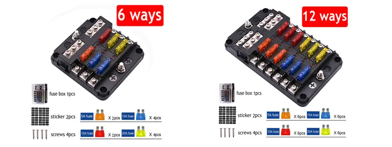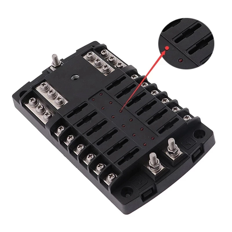 Когда горит светодиодный светильник, это означает, что предохранитель отключен, и его нужно будет своевременно заменить, чтобы продолжить работу Этот блок предохранителей с 2 входами и 12 способами цепи добавил черный аналоговый винт для фиксации защитной крышки