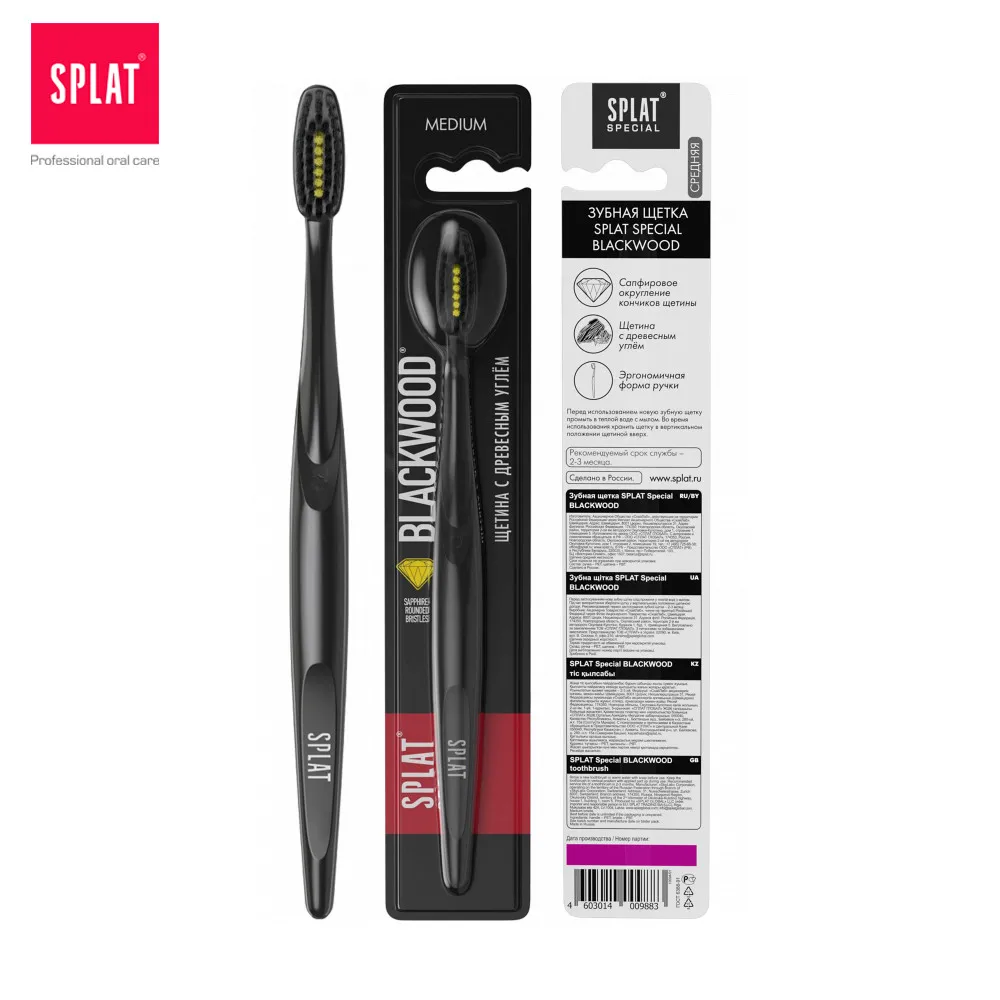 Зубная щетка BLACKWOOD, средняя/medium Зубная щетка Special Черное Дерево средняя, которая не просто механически очищает полость рта, но и наравне с пастой ухаживает за ЭМАЛЬЮ и ДЕСНАМИ. Щетка эргономичной формы выполнена из плотного ударопрочного, гигиеничного пластика. Особенность модели ― необычная щетина средней жесткости. В ее состав специалисты ввели частицы ДРЕВЕСНОГО УГЛЯ. Природный компонент нейтрализует, осаждает опасные вещества. В результате улучшается качество ЕЖДЕНЕВНОЙ чистки. Уникальная щетка на новом уровне помогает нормализовать микрофлору полости рта, предупреждает воспалительные процессы, способствует заживлению поврежденных мягких тканей. Способ применения: Перед использованием новую зубную щетку Special Blackwood Medium от SPLAT промыть в теплой воде с мылом. Во время использования хранить щетку в вертикальном положении щетиной вверх. Рекомендуемый срок службы ― 2-3 месяца - Сапфировое округление кончиков щетины – безопасно полирует эмаль, не травмируя ее Щетина с древесным углем. Не только поверх щетинок, но и в самой структуре! Уголь эффективно очищает от налета и бактерий, способствует предотвращению развития кариеса. - Эргономичная форма ручки для безопасного и эффективного очищения зубного налета. - НА 30%* больше щетины - Жесткость щетины: средняя - Щетина: PBT (0,2 KR) *по сравнению с зубной щеткой SPLAT Professional Complete
