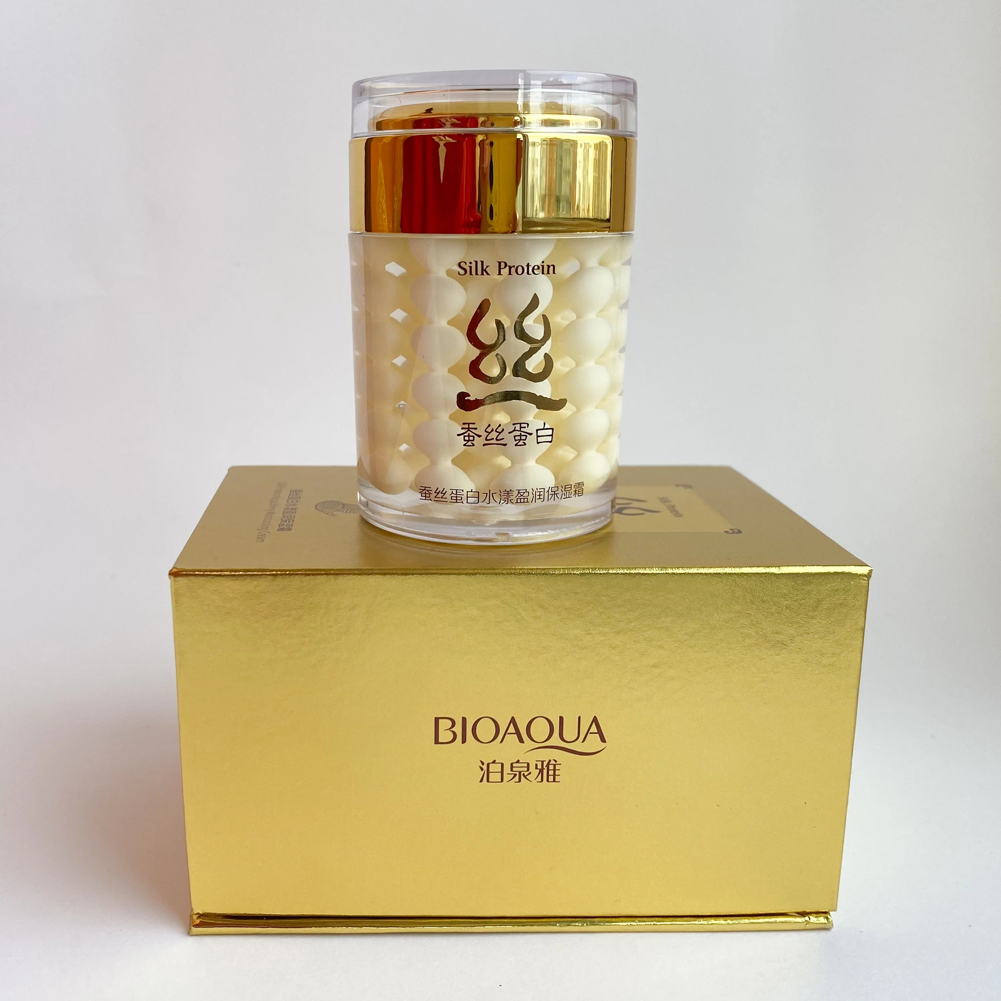 Увлажняющий крем для лица с шелком Silk Protein BIOAQUA Назначение – увлажнение, улучшение цвета Количество в упаковке 60 гр. Увлажняющий крем BioAqua Silk Protein с протеинами шелка — прекрасный универсальный помощник в борьбе с обезвоженностью кожи и возрастными изменениями. Хорошо увлажняет, регулирует и нормализует работу сальных желез, выравнивает цвет и тон кожи, оказывает мощный антивозрастной эффект. Протеины шелка, проникая в глубокие слои кожи, помимо увлажнения и сохранения влаги, запускают процесс выработки коллагена и эластина, благодаря чему при регулярном применении средства кожа выглядит красивой, молодой и упругой. Преимущества увлажняющего крема BioAqua Silk Protein с протеинами шелка:Исчезают воспаления. Кроме того, что протеины шелка прекрасно увлажняют кожу, они нормализуют работу сальных желез, регулируют жирность кожи. В результате того, что поры не забиваются излишками жира, отсутствует воспалительный процесс как таковой. Вы забудете о прыщах, угрях и комедонах.Увлажнение и омоложение. Протеины шелка известны во всем мире своим многофункциональным воздействием, поэтому успешно используются в косметических средствах как универсальное средство для ухода за зрелой проблемной кожей.Заживляющий эффект. Крем содержит в составе календулу, которая прекрасно заживляет внешние повреждения кожи и оказывает сильное противовоспалительное действие, благодаря чему при регулярном применении крема исчезают прыщи, угри и покраснения. Стильная прозрачная баночка с кремом надежно упакована в золотистую коробку из плотного картона, стилизованную под сундучок с магнитом. Внутри баночки — белые «гранулы шелка», залитые гелеобразной прозрачной массой. Поставляется с лопаткой для удобства нанесения. Средство имеет приятный легкий цветочный аромат. Крем быстро и легко впитывается, идеально увлажняет. Никаких раздражений и аллергических реакций! После первого использования данного продукта кожа лица приобретает сияющий и здоровый вид, становится очень гладкой и шелковистой. А по истечении месяца регулярного использования крема проявляется мощный омолаживающий эффект: кожа подтягивается, становится ровнее, более упругой, улучшается цвет и рельеф кожи, исчезают морщины.Способ применения: До нанесения необходимо смешать лопаткой белые гранулы с прозрачной гелеобразной массой. Образованный микс наносите на кожу лица утром, после умывания. Вечером — после применения сыворотки или эмульсии, для закрепления эффекта от их воздействия. Состав: Water, pearl powder (marine and oceanic), trehalose glycosyl, AVENA SATIVA oats, vitreous silk, vitamin E, stearic acid, PEG-120, olive oil, almond oil, hydroxyethyl cellulose, carbomer, potassium hydroxide, VE oil, VC Wood, VB3, phenoxyethanol, isobutyl thiazolidinone, flavor.