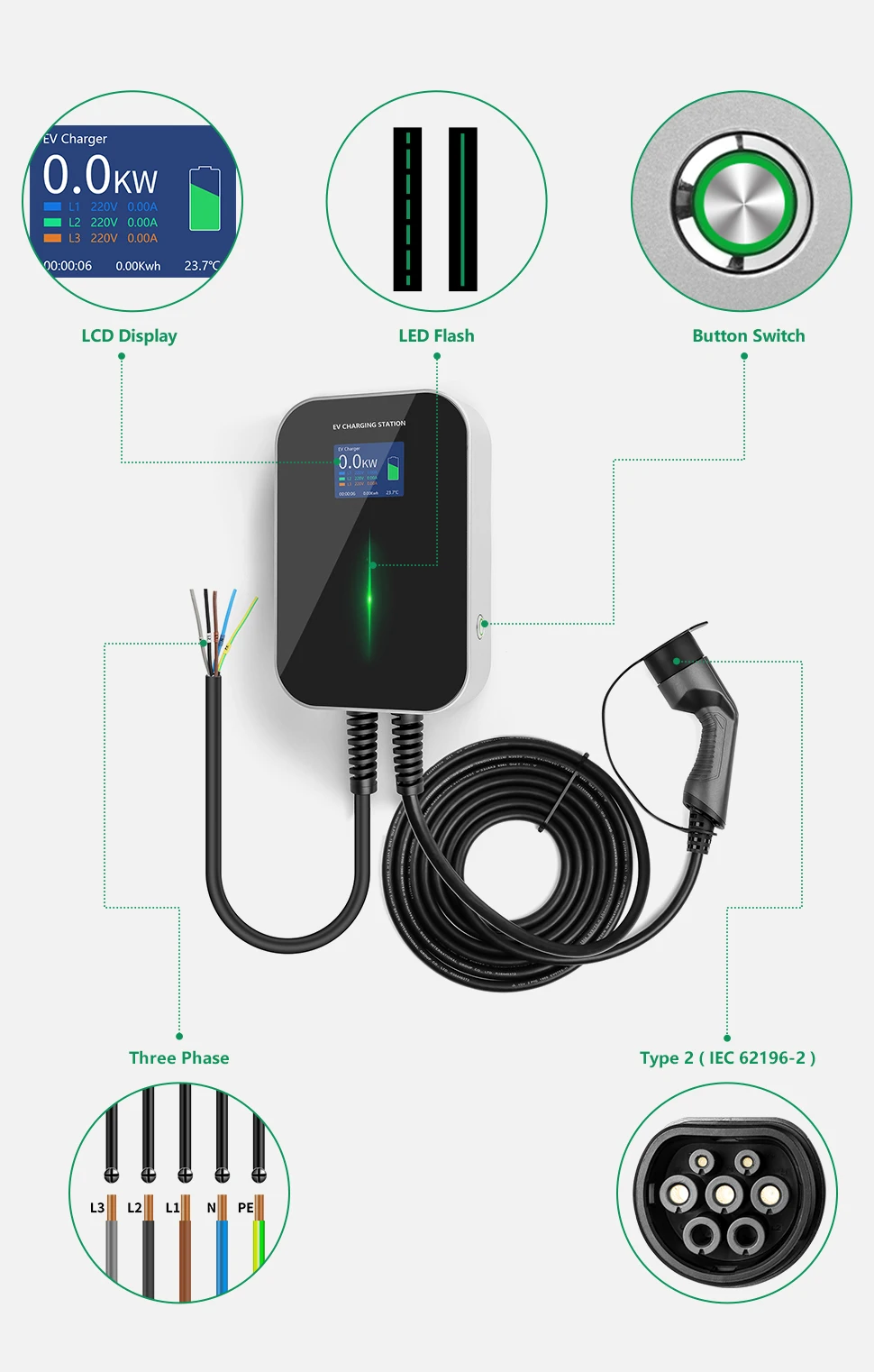 Большой ЖК-дисплей для отображения всех данных автомобиля на зарядной станции во время зарядки. Вы можете увидеть состояние зарядки, включая ток, напряжение и температуру. Винты помещаются в коробку, поэтому вам не придется беспокоиться о падении экрана. 20 футов кабель оставляет достаточно места между вашим автомобилем и зарядной станцией.