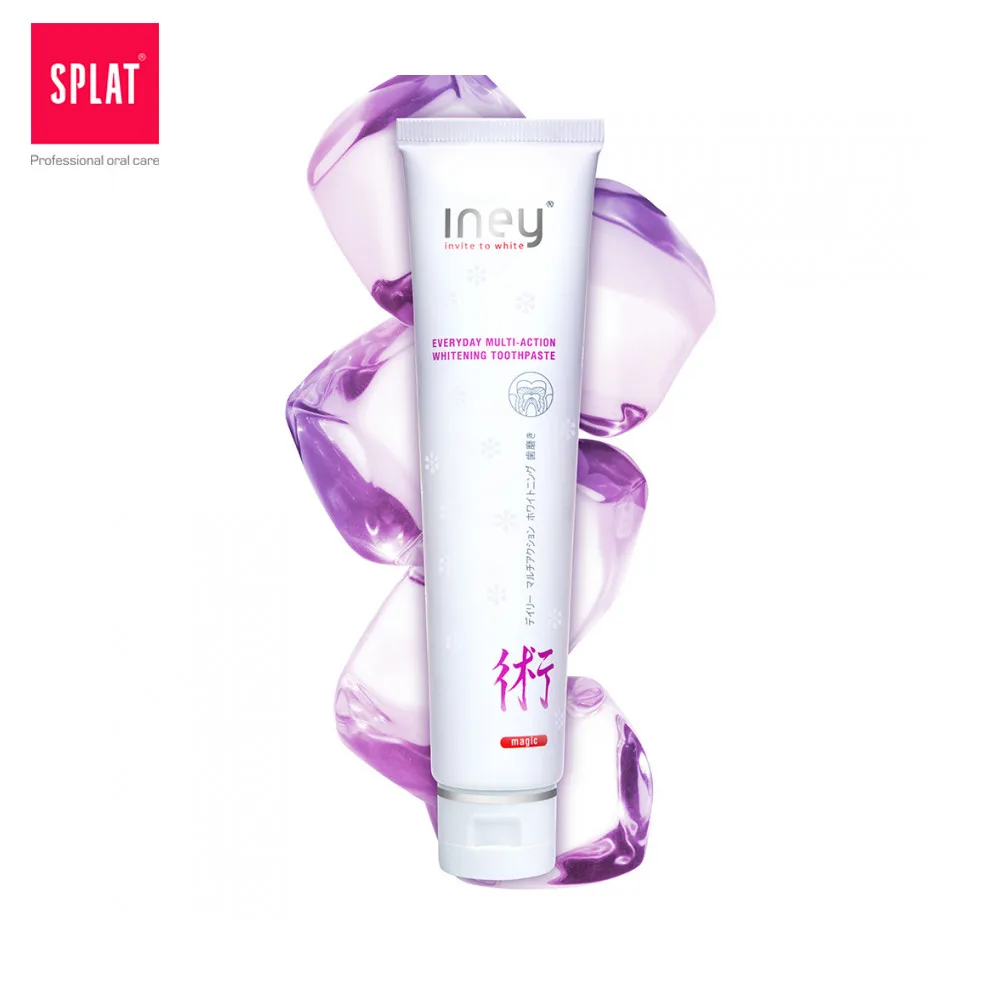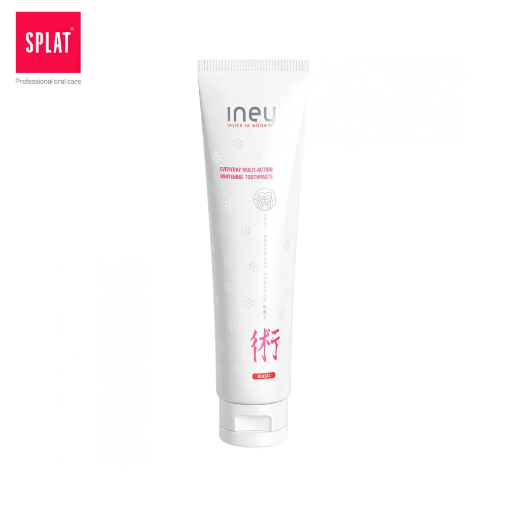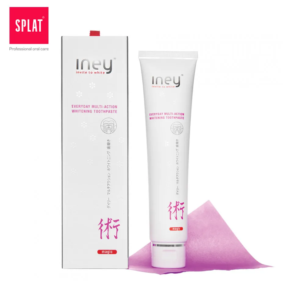 Тонизирующий аромат розмарина, майорана, аниса, лайма и ледяной мяты. Отбеливающая зубная паста Splat "Iney Dream" с эффектом интенсивного укрепления и восстановления эмали. Интенсивное отбеливание и укрепление эмали одновременно теперь возможно. Первые в мире зубные пасты категории beauty oral care. Первые пасты на Российском рынке, в состав которых входит гидроксиапатит в активной форме (основное вещество, из которых состоит зубная эмаль). Гидроксиапатит, находясь в особой форме, встраивается в зоны повреждений, восстанавливая и уплотняя структуру эмали, делает ее ровной и блестящей. Клинически доказано, мультиактивные пасты INEY® для ежедневного применения на основе революционной системы SNOW-HOW® обладают уникальным комплексным эффектом: