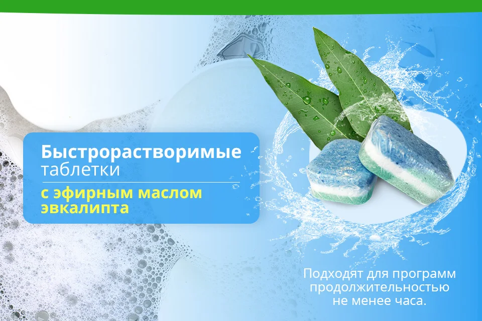Таблетки быстро растворяются в воде, смягчая ее, тем самым предупреждая образование известкового налета, способствуя более надежной и долговечной работе машины. Каждая таблетка находится в водорастворимой упаковке, нет необходимости удалять обертку. Придают посуде приятный аромат свежего эвкалипта.