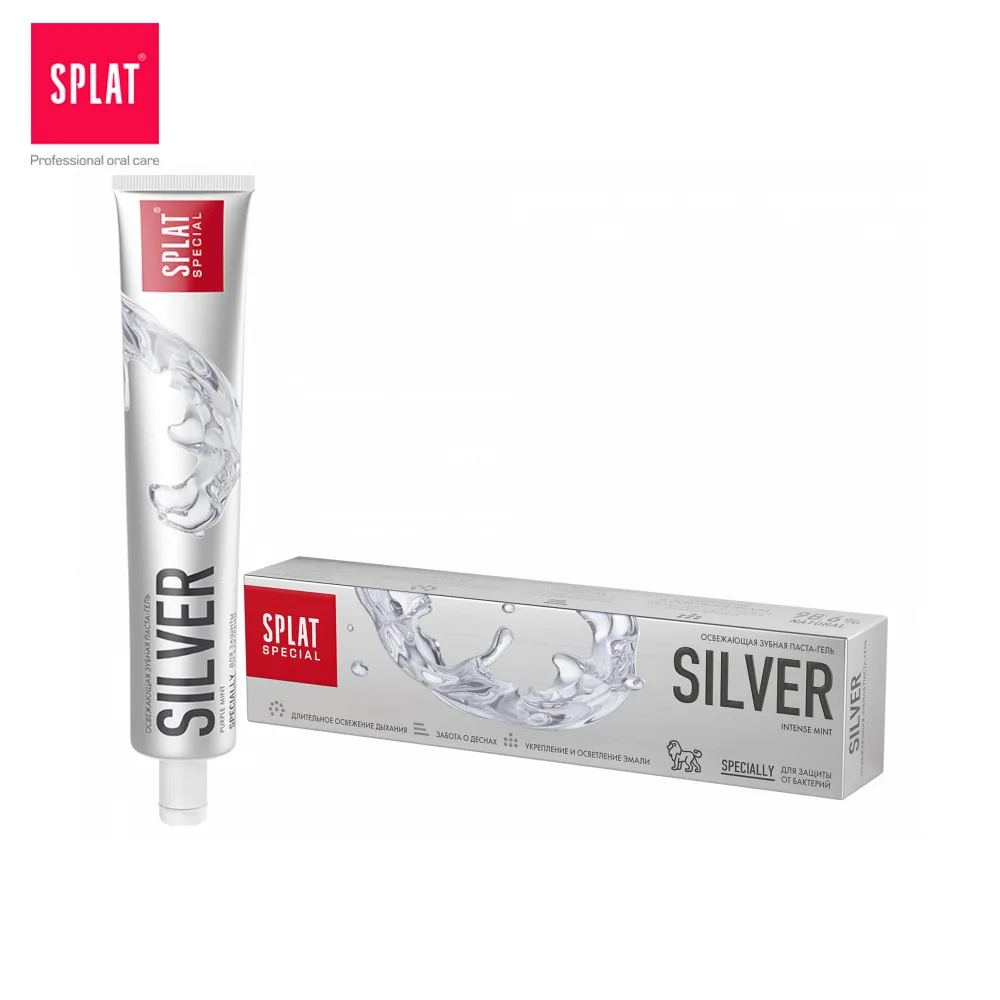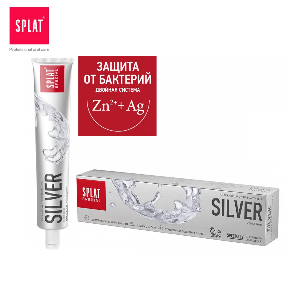 Зубная паста без фтора СПЛАТ СЕРЕБРО для защиты от бактерий и бережного осветления эмали. Серебро в активной форме, глюконат цинка, экстракт периллы и эфирное масло перечной мяты блокируют жизнедеятельность бактерий и обеспечивают длительную свежесть дыхания. Экстракт ратании и антибактериальный компонент Bisabolol заботятся о деснах. Гидроксиапатит, обогащенный минералами кальция, магния, цинка, и полидон унтенсивно укрепляют эмаль, оказывают антибактериальное и противовоспалительное действие.