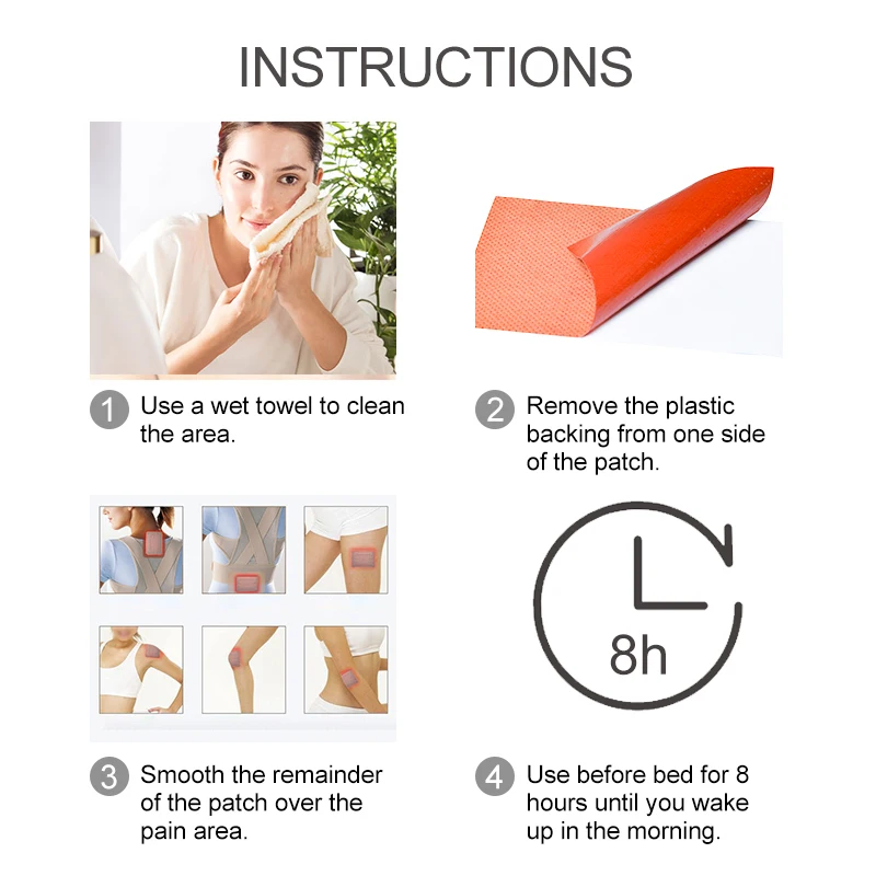 8. Если боль восстанавливается через 8-12 часов после применения первого пластыря, можно нанести второй пластырь. Пожалуйста, удалите первый пластырь перед