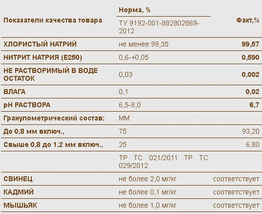 Нитритную соль покупают для производства мясопродуктов. Эта комплексная пищевая добавка содержит хлористый натрий и нитрит натрия — консервант E250. Он препятствует окислению жиров и обладает бактерицидными свойствами.
