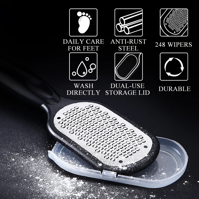 Более 200 мини-лезвий из нержавеющей стали для эффективного удаления толстых мозолей, плохой пятки и жесткой глубокой кожи. Другая тонкая сторона для разглаживания и размягчения ваших ног в конце отшелушивания. Используйте обе стороны для полного домашнего лечения мозолей.