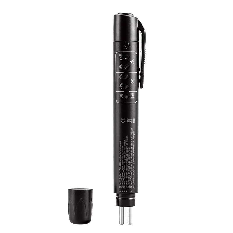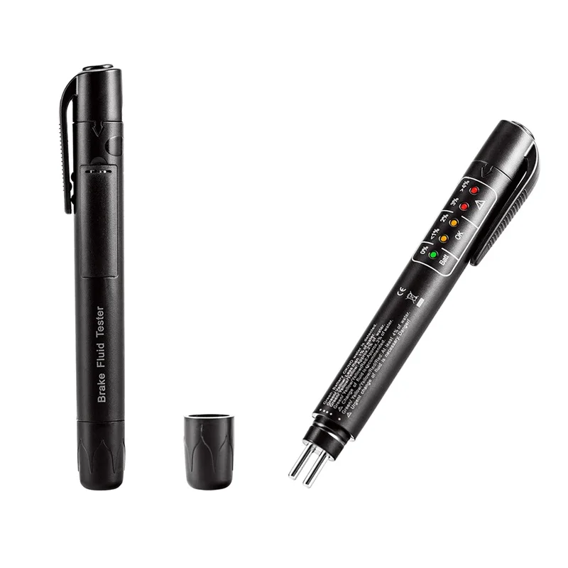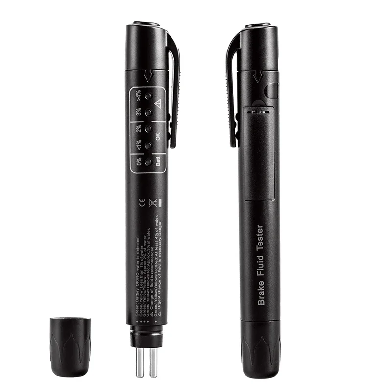 Ручка для обнаружения тормозной жидкости основана на изменении проводимости для определения изменения влажности тормозной жидкости. Он четко показывает степень влаги, содержащейся светильник светоизлучающих диодах, высокое содержание влаги приведет к снижению температуры кипения, что влияет на эффективность торможения. Красный указывает на необходимость немедленной замены тормозной жидкости, зеленый цвет-хорошее состояние, желтый-состояние приемлемо, но вскоре замена.