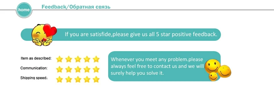 Мы поддерживаем высокие стандарты качества и стремимся к 100% удовлетворенности клиентов! Если у Вас возникли какие-либо проблемы после получения товара, или если вы не удовлетворены продукцией, пожалуйста, свяжитесь с нами немедленно, прежде чем дать нам нейтральные или негативные отзывы, чтобы мы могли удовлетворительно решить ваши проблемы. Спасибо, что искали и довольны покупками!