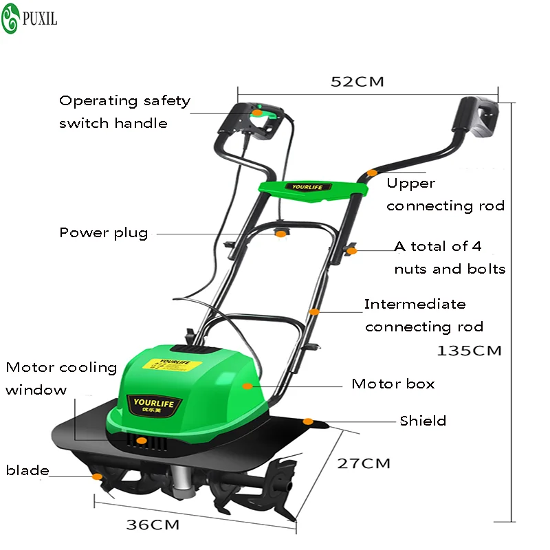 Модель изделия: TLEG-01A Мощность: 1500 Вт Максимальная ширина обработки почвы: 460 мм Напряжение: 230-240 В ~ 50 Гц Скорость без нагрузки: 390rmp Размер измельчения: 180*360 мм Размер коробки: 38*42*62 мм Всей машины вес: 9,6 кг