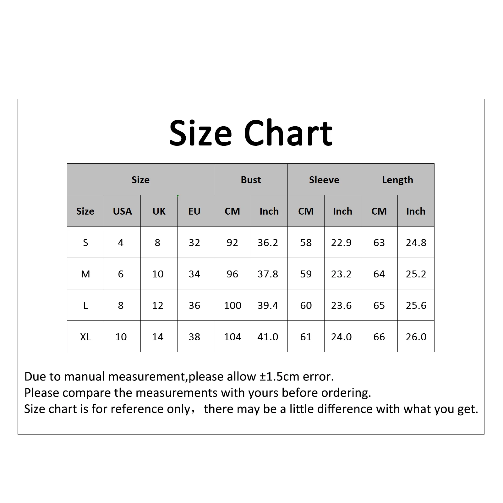 [Наш Размер S] Бюст: 92 см/36,2 дюйма, рукав: 58 см/22,8 дюйма, длина: 63 см/24,8 дюйма (прибл.)