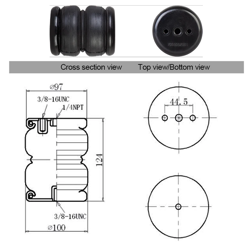 Двойная запутанная пневматическая пружинная подвеска диаметром 100 мм 2S2200 / 2H2200 / 2E2200 для системы подвески Технические данные Высота конструкции: 125 мм Диаметр конструкции: 100 мм Воздушный Порты и разъёмы: 1/4NPT Глухая гайка: 3/8-16UNC