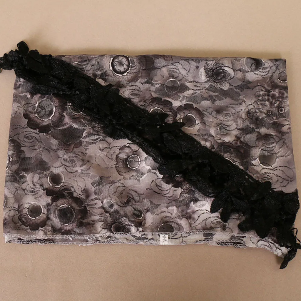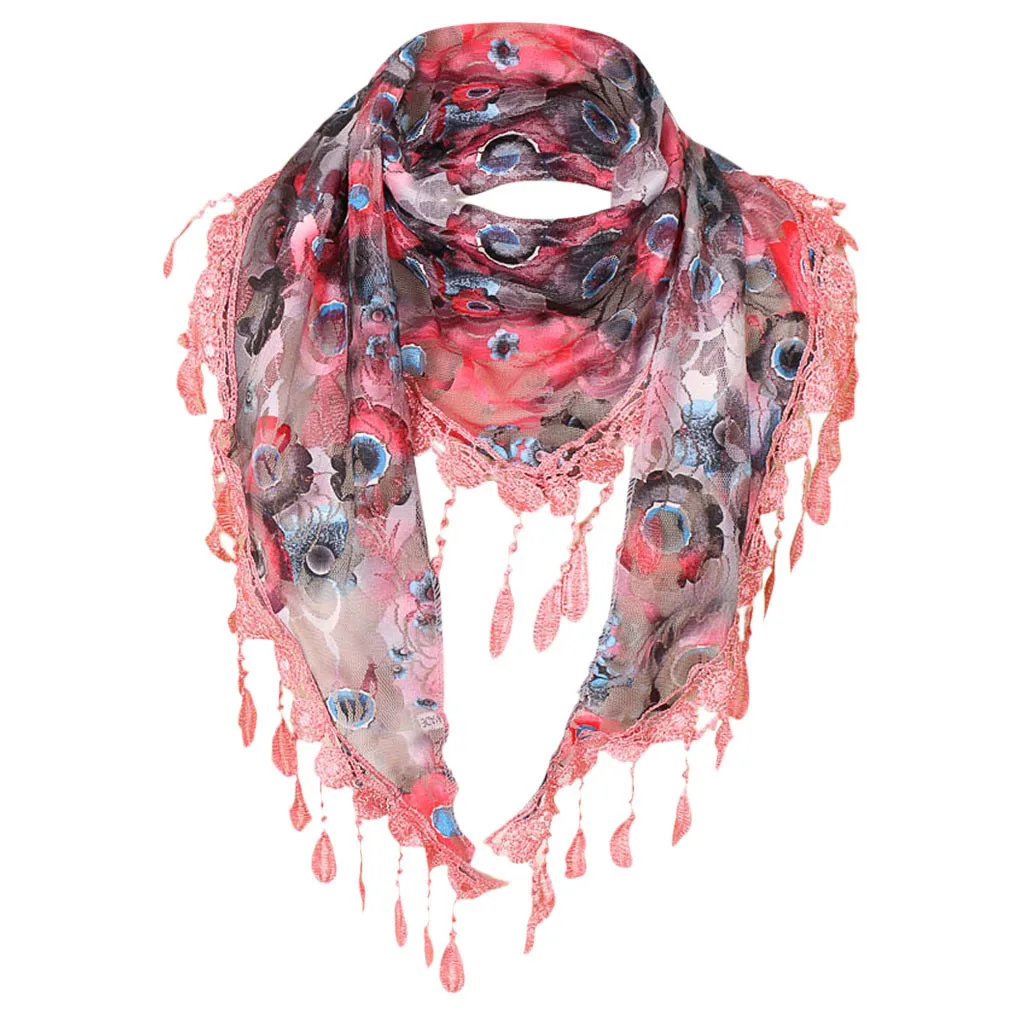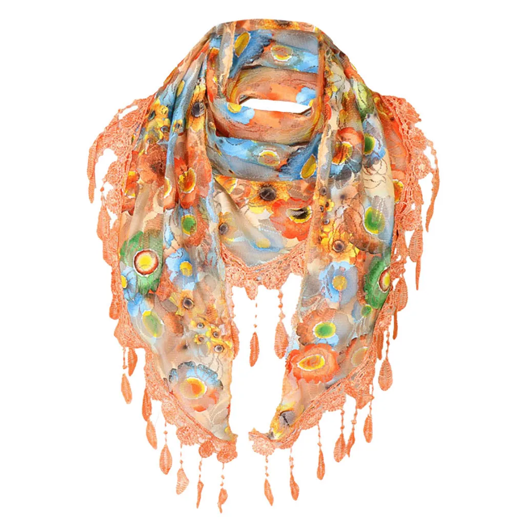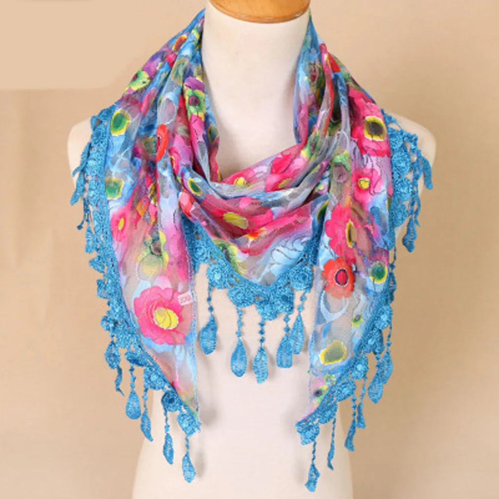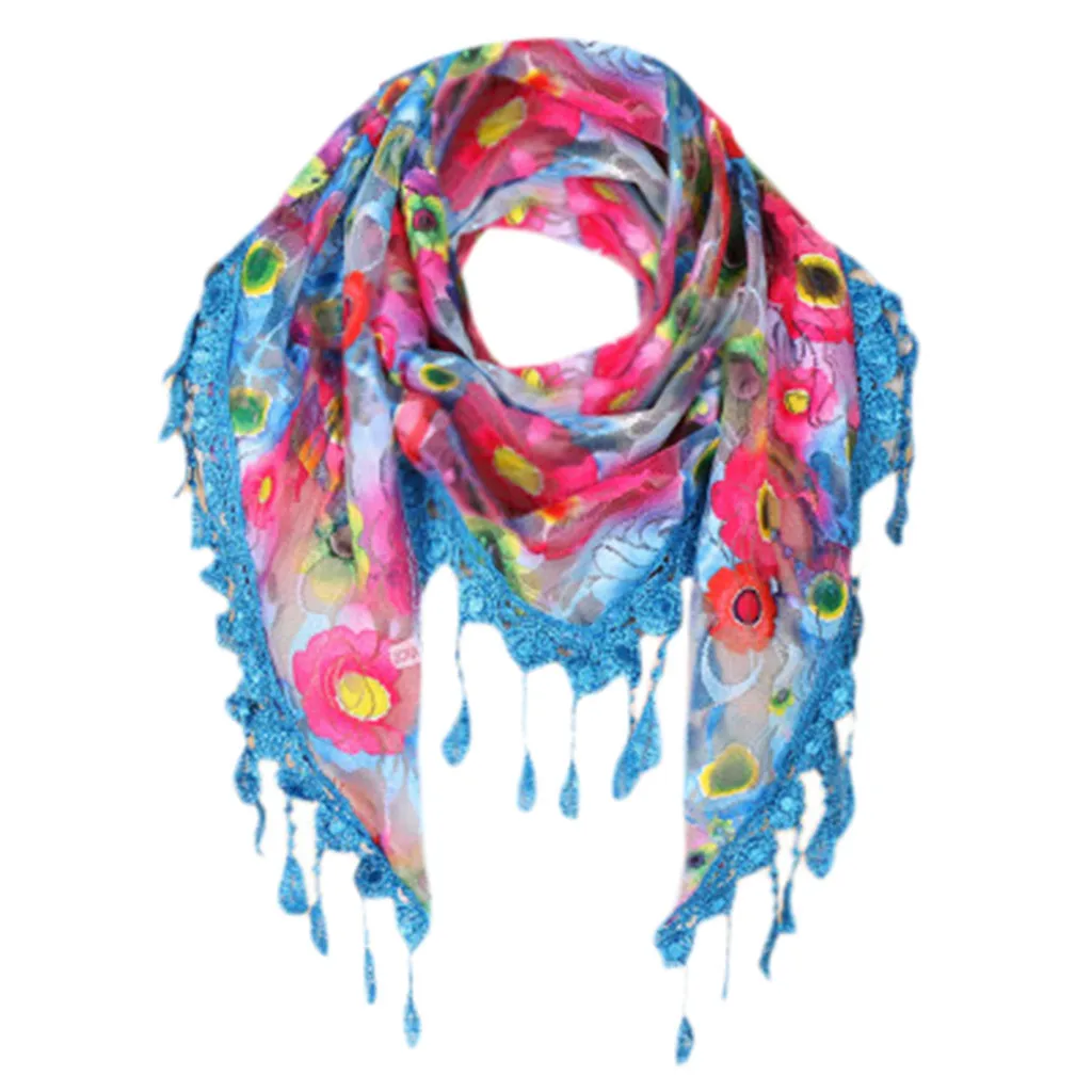 Женский кружевной разноцветный шарф с кисточками и цветочным принтом
