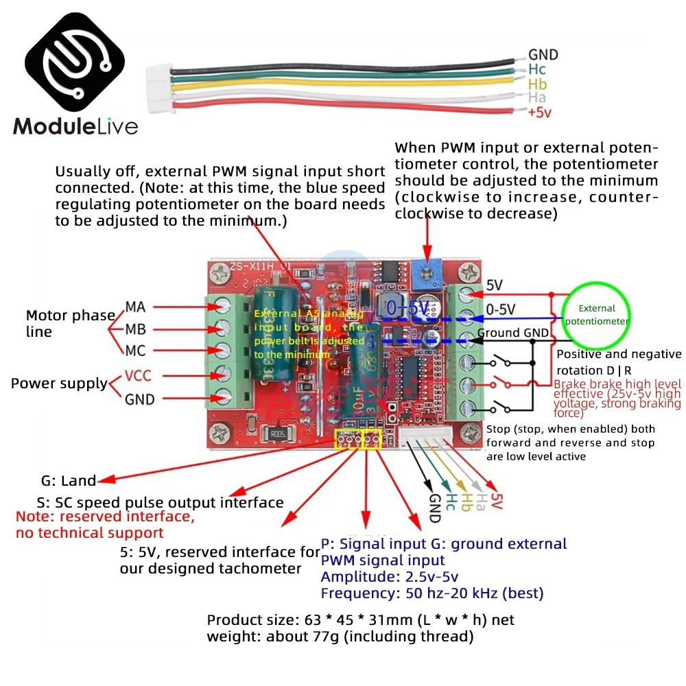 6. Контроль скорости контроль скорости входной сигнал (Встроенный потенциометр для контроля скорости также может быть внешне подключен к аналоговому количеству 0-5 В, поддержка PWM до 0-5 входного сигнала для контроля скорости)