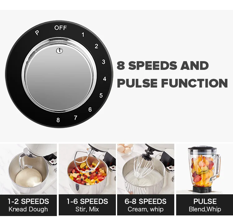 ● 8 скоростей плюс функция импульса-доступ к многоцелевым и разнообразным рецептам с переменной скоростью от низкого до высокого, разминать и взбивать ингредиенты быстро и легко. Пульс может достигать самой высокой скорости за секунду, отлично подходит для биения яичных белков и смешивания. Планетарное смешивание обеспечивает более тщательное смешивание, избегая попадания любой смеси вокруг края чаши.