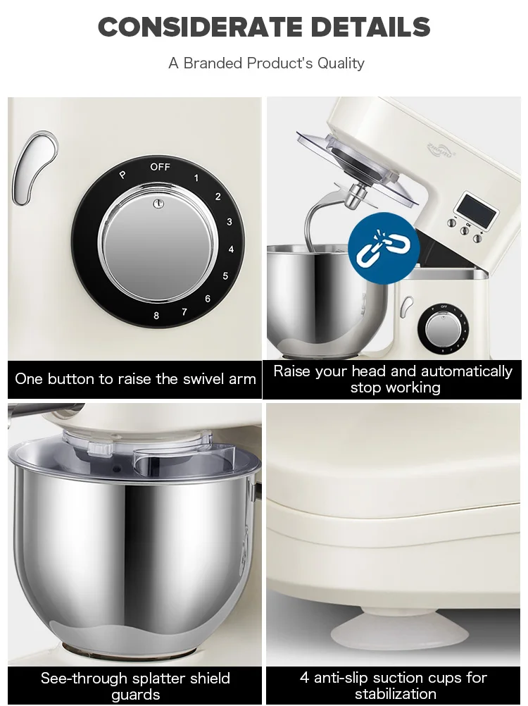 ● 5.2L чаша из нержавеющей стали-достаточно мощности для того чтобы смешать тесто для до 7 десятка печенье, 2 хлеба, 2 гироборд с колесами 8 дюймов торты, идеально подходит для изготовления небольших партий десертов, миксы для торта и глазурь. С 4 нескользящими присосками Прикрепите Электрический миксер к столу и держите его на месте, не тряся.