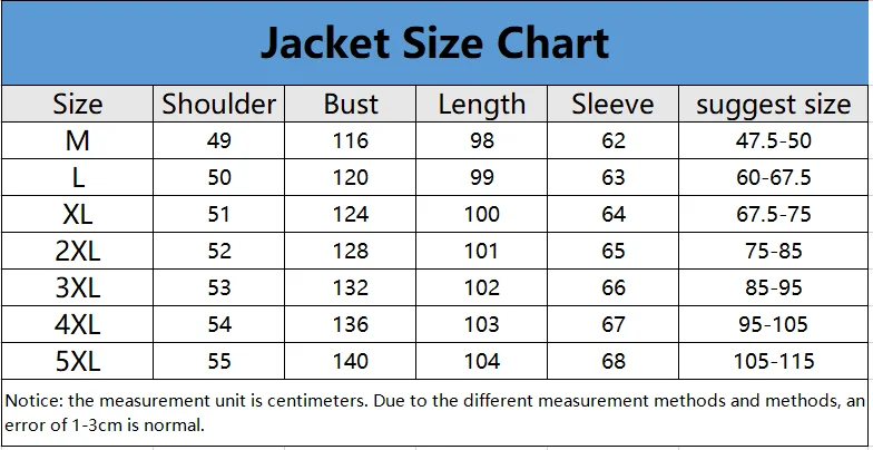 1. Пожалуйста, проверьте таблицу размеров перед размещением заказа. Мы искренне надеемся, что вы можете купить одежду, которая полностью подходит. 2. Из-за различных методов измерения, данные измерений интенсивности растяжения могут выходить вверх и вниз примерно на 1-3 см погрешности. (1 дюйм = 2,54 см) 3. Если вы не уверены в своем размере, пожалуйста, свяжитесь с нами. Или оставьте сообщение о ширине плеч и груди, росте и весе, мы порекомендуем вам правильный размер.
