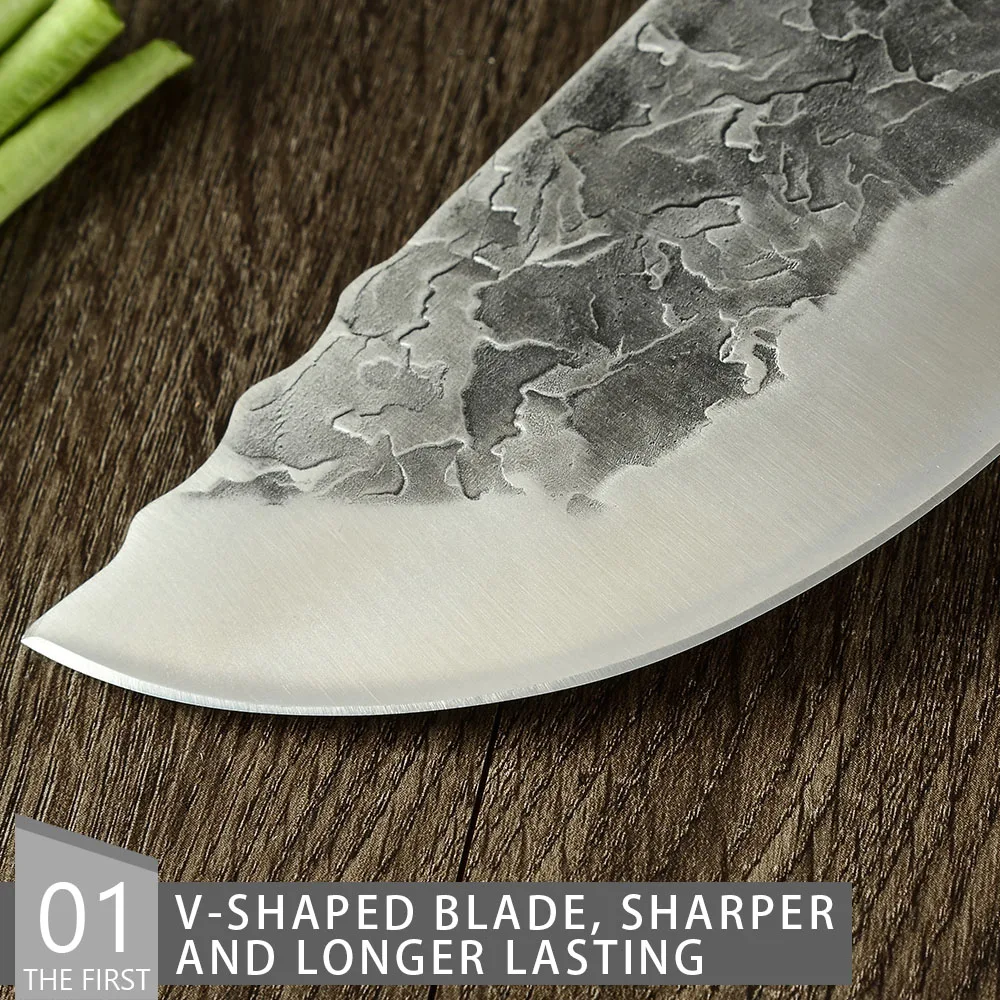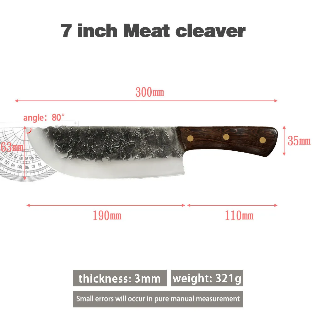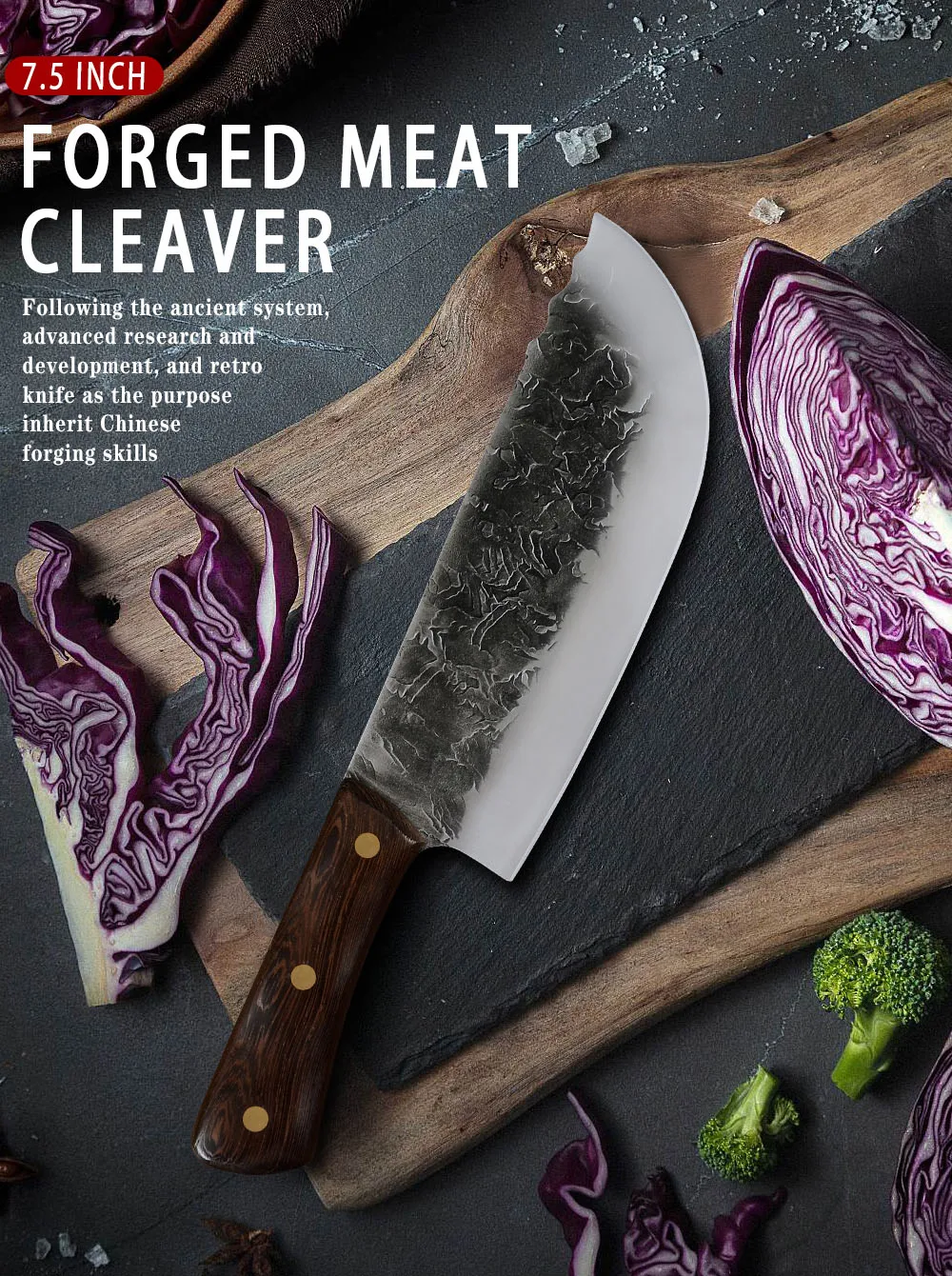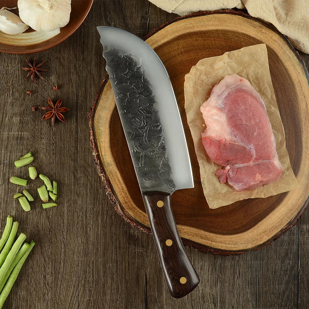 Multi-purpose knife It can be used for mincing, slicing, and chopping vegetables, slicing, dicing and mincing meat, Especially good for chopping ribs. Ultra Sharp Blade Hardness of 58 HRC of curved-blade means the slicing blade is hard and boasts exceptional edge retention,anti-rust and anti-corrosion,you can easily use different sharpening tools to sharp it after a long-time use. Full Tang knife handle Made of log wood material, so the color or grain of the handle of each knife will not be exactly same.Ergonomic & comfortable design handle, it features textured finger points that provide slip resistance and a better grip, make it more easy to hold, so you will not feel tired for using a long time. Handmade Forging The meat cleaver are sharpened manually by workers with more than 30 years of experience by using natural knife grinders mined from Mount Emei. Compared with kitchen knives made with mechanical ways, the service life of such knives is longer.