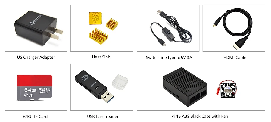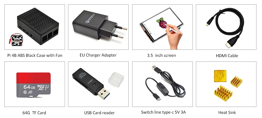 -Черный корпус Raspberry Pi 4b ABS -Источник питания Raspberry Pi 4b EU -Raspberry Pi 4b type-c кабель -Комплект радиаторов Raspberry Pi 4b -3,5 дюймовый экран -Sd-карта класса 10 64G -Кард-ридер