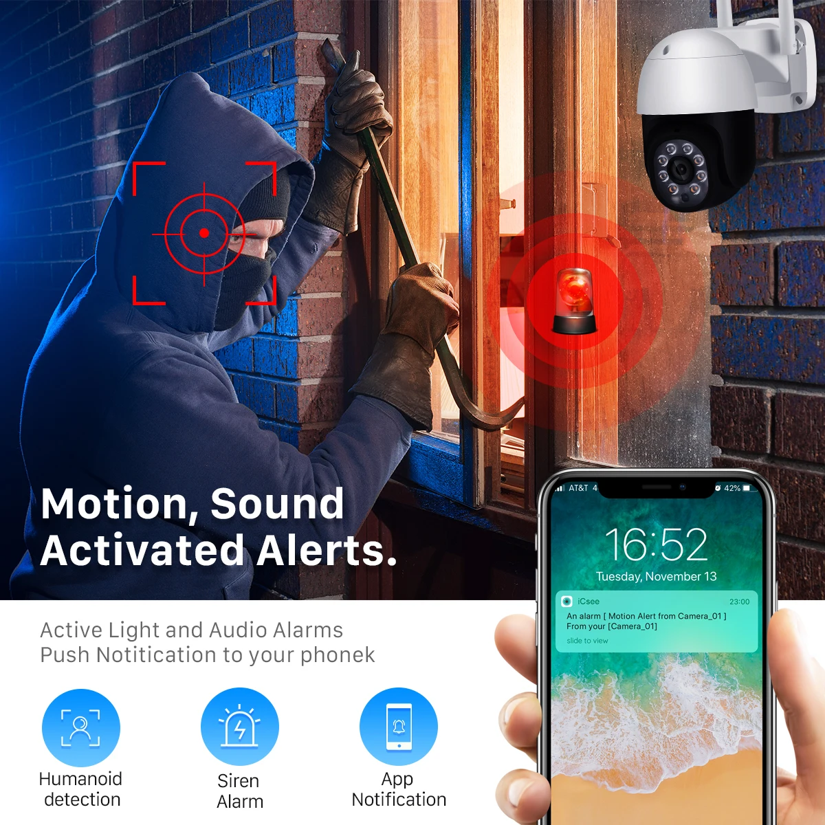 При обнаружении движения сигнал тревоги будет отправлен на мобильный телефон через приложение. Кроме того, вы можете записывать процесс и воспроизводить запись через приложение