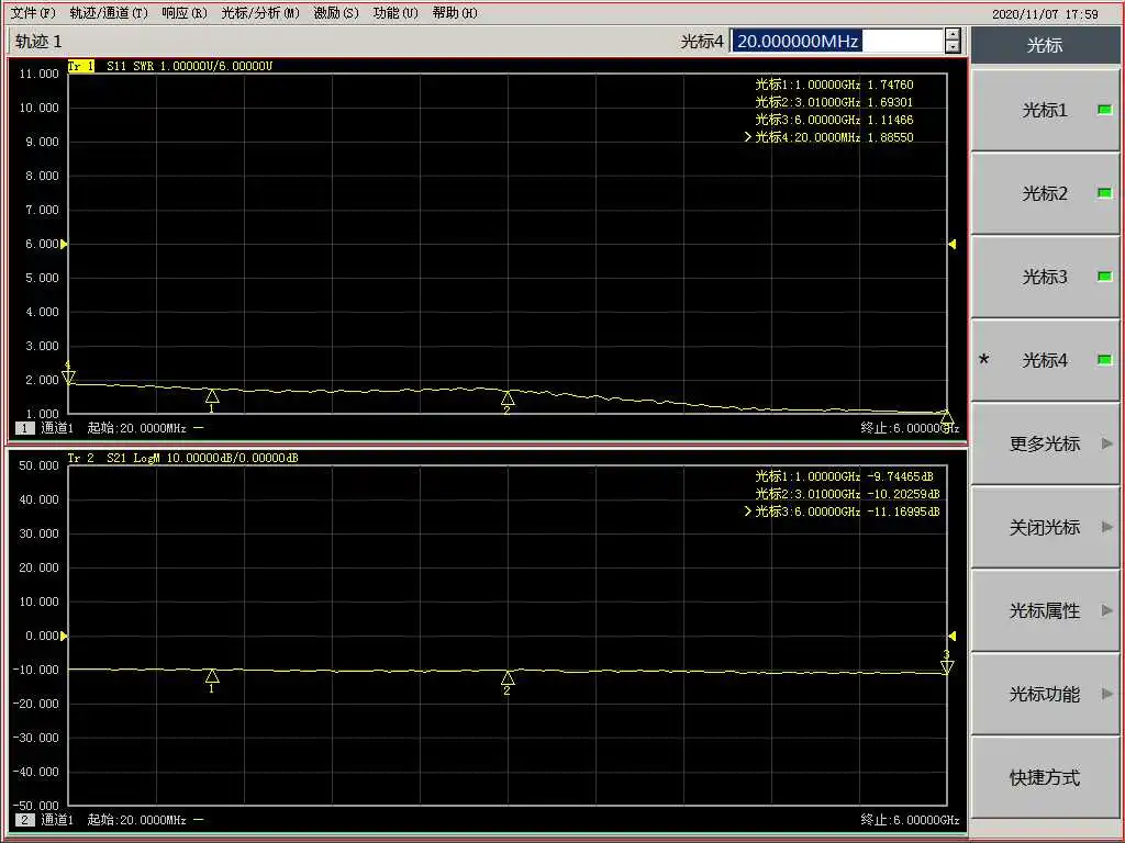 3,4 измеренный параметр S, когда напряжение порта управления напряжением составляет 2,67 в (затухание 20 дБ)