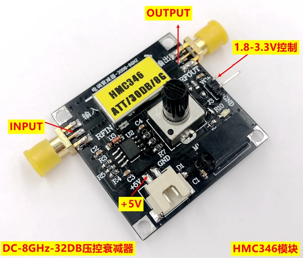 Технические индикаторы модуля 1. Напряжение источника питания: + 5 В, интерфейс XH2.54, может быть подключен к линии DuPont; 2. Диапазон частот: DC-8GHz; 3. Потеря вставки: 1-3 дБ (низкочастотная DC-6GHz); 4. Управление напряжение: 1,8-3,3 V (положительное напряжение Управление); 5. Максимальная входная мощность: + 18dBm; 6. Входной и выходной интерфейс: SMA внешний винт, внутреннее отверстие 7. Входное и Выходное сопротивление: 50 Ом.