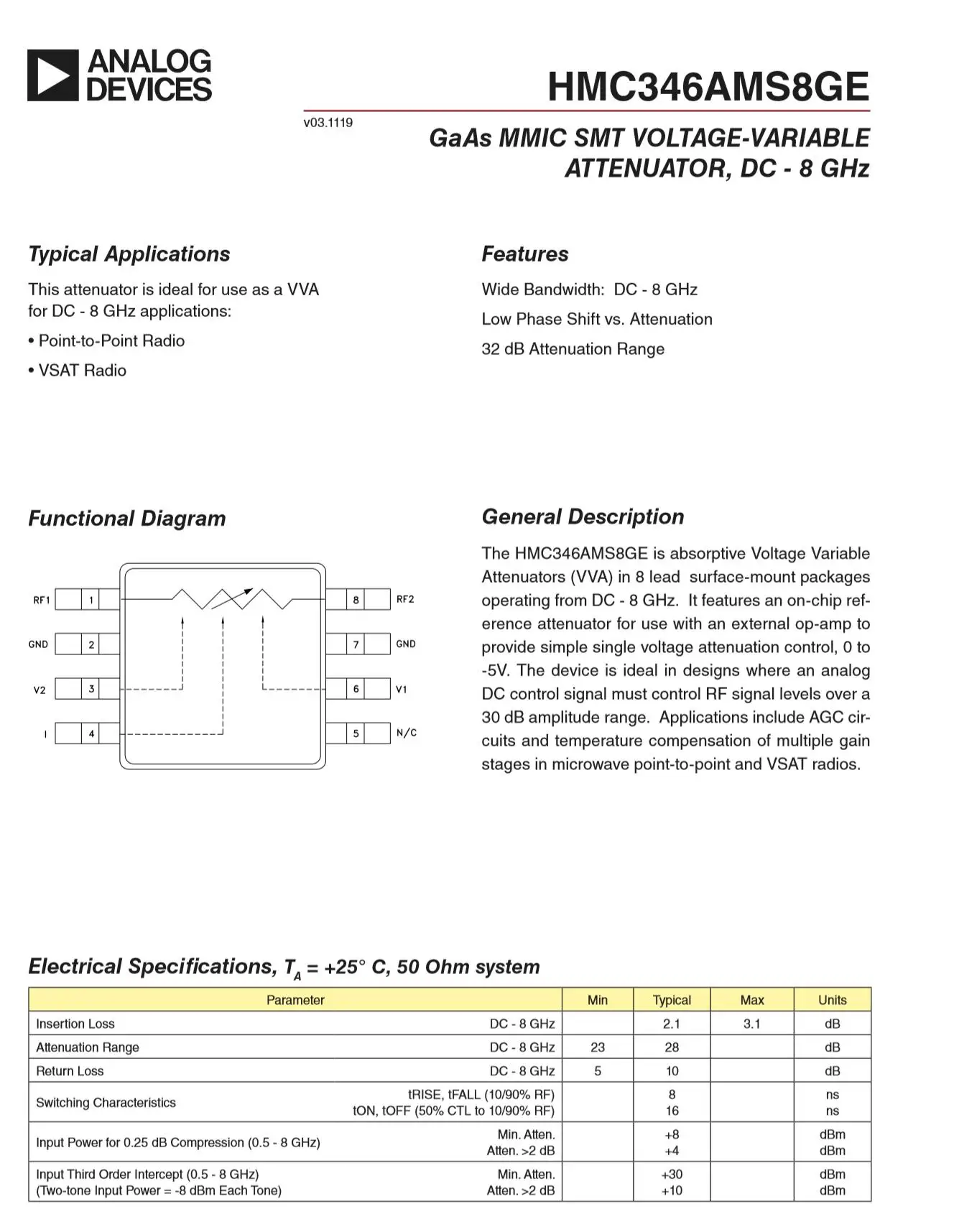 HMC346 светодиодный аттенюатор управления напряжением (VCA) имеет большой динамический диапазон затухания, отличное затухание с контролем Линейность изменения напряжения, отличные входные и выходные волны и другие отличные характеристики. HMC346 аттенюатор с контролем напряжения может широко использоваться в системах базовой станции связи, системах широкополосной связи, микроволновой связи, спутниковой связи, военной беспроводной связи Электричество, радар и тестовые электронные системы.