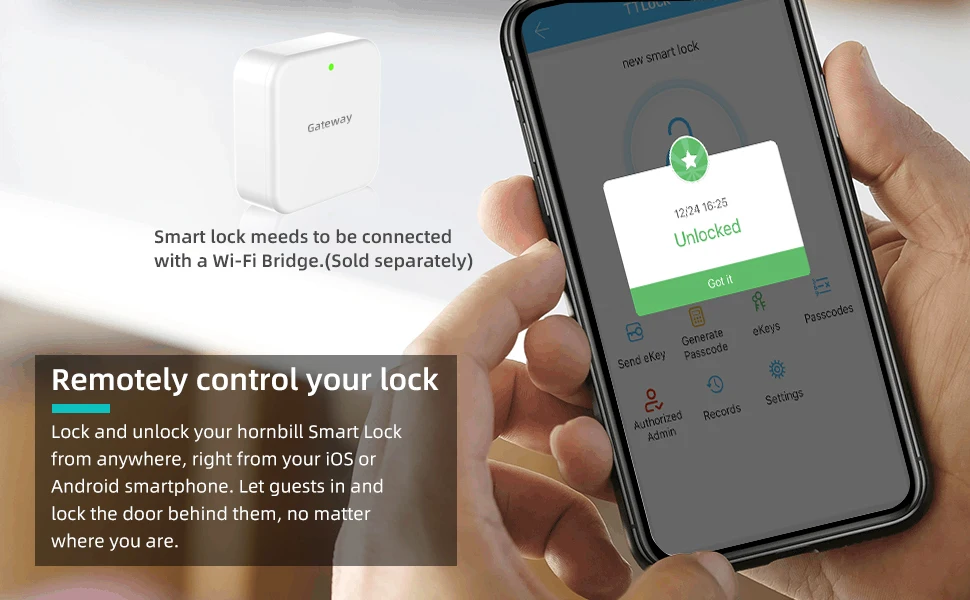 Voice Control: Add a hornbill Wi-Fi Bridge (sold separately) to remotely lock/unlock and monitor, your door as well to integrate with Alexa to enable Voice Control.