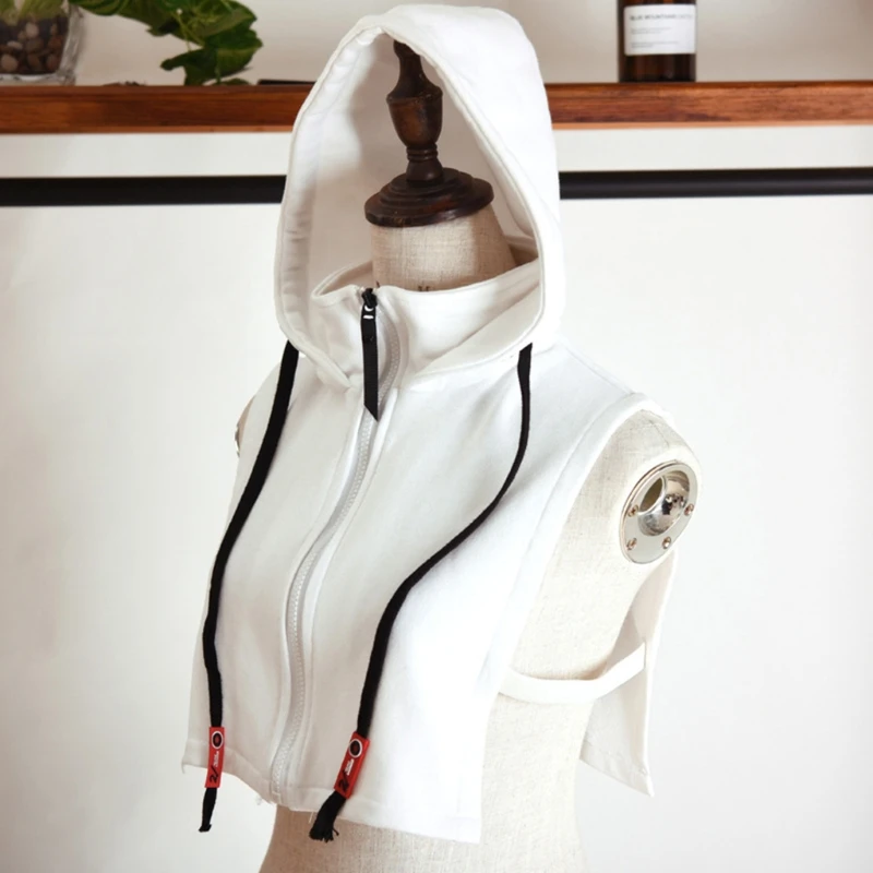 Модель без рукавов; Однотонная толстовка с капюшоном на завязках; Застежка-молния спереди.