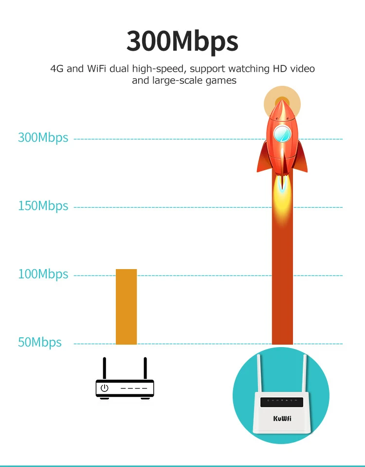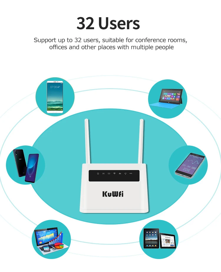 Пожалуйста, обратите внимание: он может работать в России, ЕС, Азии, Ближнем Востоке, Северной Америке, Южной Америке Версия-1 4G LTE FDD:B1/B3(2100/1800 МГц) 3G WCDMA:B1(2100 МГц) 2G GSM:B1(2100 МГц) Работает в большинстве стран Азии Версия-2 4G LTE FDD:B1/B3/B8(2100/1800/900 МГц) 4G LTE FDD:B38/B39/B40/B41(2600/1900/2300/2500 МГц) 3G WCDMA:B1/B8(2100/900 МГц) 2G GSM:B3/B8(1800/900 МГц) Работает в большинстве стран ЕС, Азии, Африки Версия-3 4 аппарат не привязан к оператору сотовой связи FDD:B1/B3/B7/B8/B20(2100/1800/2600/900/800 МГц) 4G LTE FDD:B38/B39/B40/B41(2600/1900/2300/2500 МГц) 3G WCDMA:B1/B8(2100/900 МГц) 2G GSM:B3/B8(1800/900 МГц) Работает во всех странах ЕС, Азии, Африки, Океании 1. Wi-Fi роутер KuWFi 4G обеспечивает скорость беспроводной передачи данных до 300 Мбит/с, скорость 4G до 150 Мбит/с, 2,4g Wi-Fi роутер также поддерживает доступ в Интернет/режим работы PPPoE, если у вас есть 4G sim-карта, вы можете использовать подключение к модему работать в качестве режима шлюза; 3. Оснащен 4 интерфейсом локальной сети с кнопкой питания на левом размере. Когда 4G маршрутизатор передает WiFi, вы можете подключаться к другим устройствам одновременно. 4. Это легко подключиться и легко носить с собой в руке обмен клиентом для 32 пользователей WiFi, все, что вам нужно сделать, это вставить sim-карту, тогда вы будете наслаждаться Wi-Fi с друзьями с этим портативным 4G LTE роутером. 5,4G скорость передачи: TDD-LTE: 150 Мбит/с DL / 50 Мбит/с UL TD-SCDMA: 2,8 Мбит/с DL/2,2 Мбит/с UL