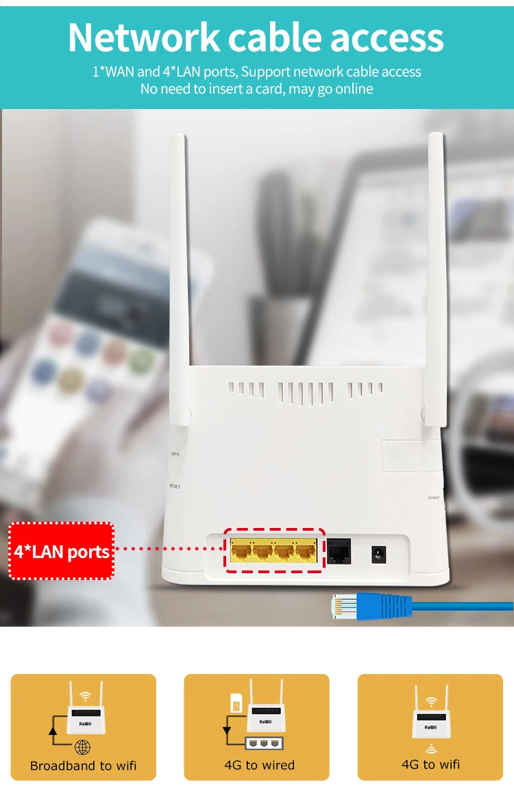 Memery:Flash/RAM: 1G Nand Flash Источник питания:,DC 12V/1A RJ45 порт: 5x RJ-45 порт (10baset/100BaseTX с Auto-MDIX IEEE 802,3/802.3u) для WAN/LAN авто Светодиодный индикатор: 1 индикатор питания 2 индикатор системы 3 индикатор модема: 3G с синим, 4G с зеленым. 4 индикатор Wi-Fi 5 индикатор WAN/LAN Sim-карта: Поддержка Micro sim-карты Антенна: Внешняя: 1х 5dbi Wifi антенна; 1х 5dbi 4g антенна Расстояние передачи: в помещении 10-30 метров; Открытый до 10-50 метров (из-за различных условий) Скорость передачи 4G: TDD-LTE: 150 Мбит/с DL / 50 Мбит/с UL TD-SCDMA: 2,8 Мбит/с DL/2,2 Мбит/с UL Макс. Номер конечных пользователей: 32