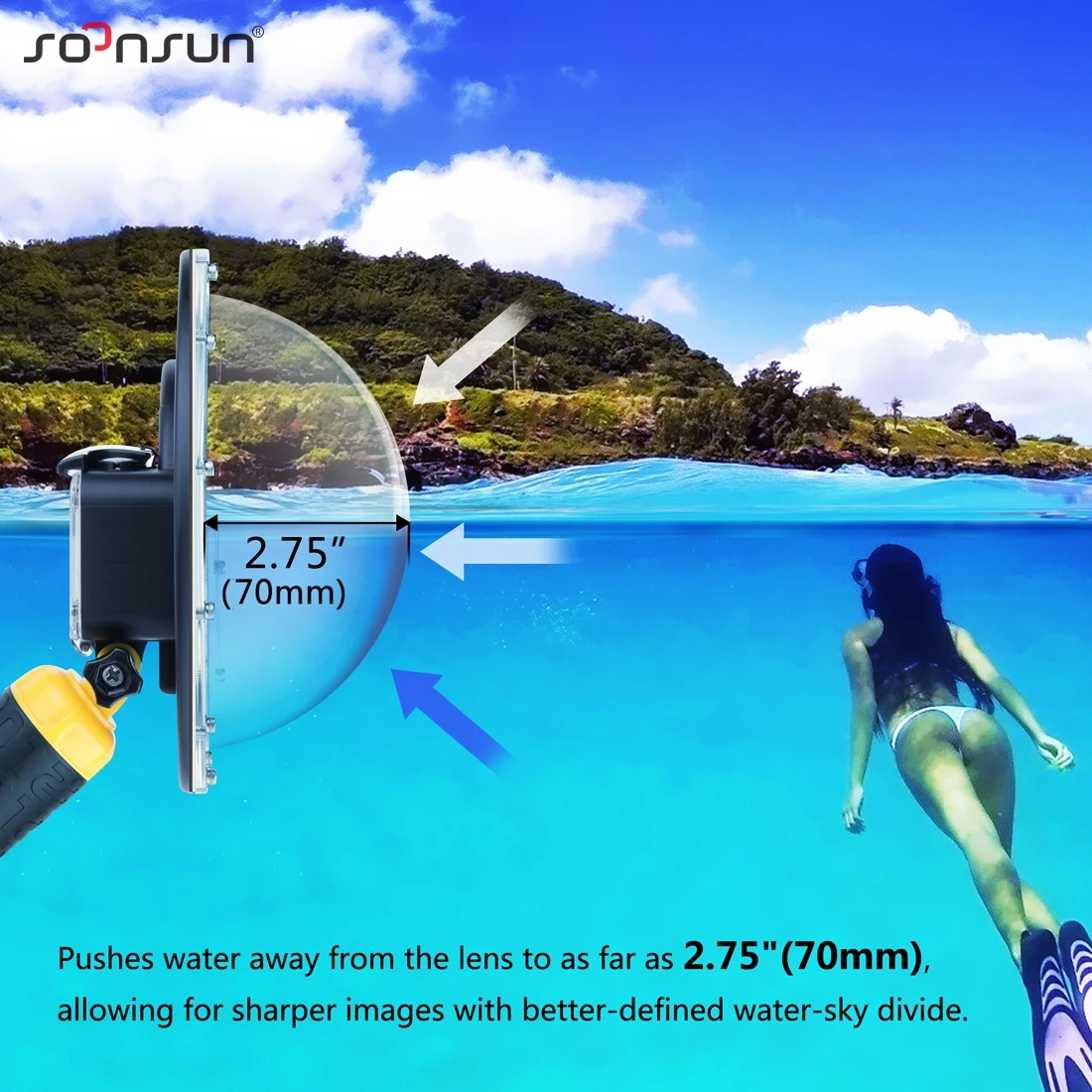 Полукруглая конструкция перемещает ватерлинию от объектива камеры, что позволяет одновременно снимать изображения как выше, так и ниже воды. Поставляется с триггерным зажимом, удобным для запуска кнопки спуска затвора.