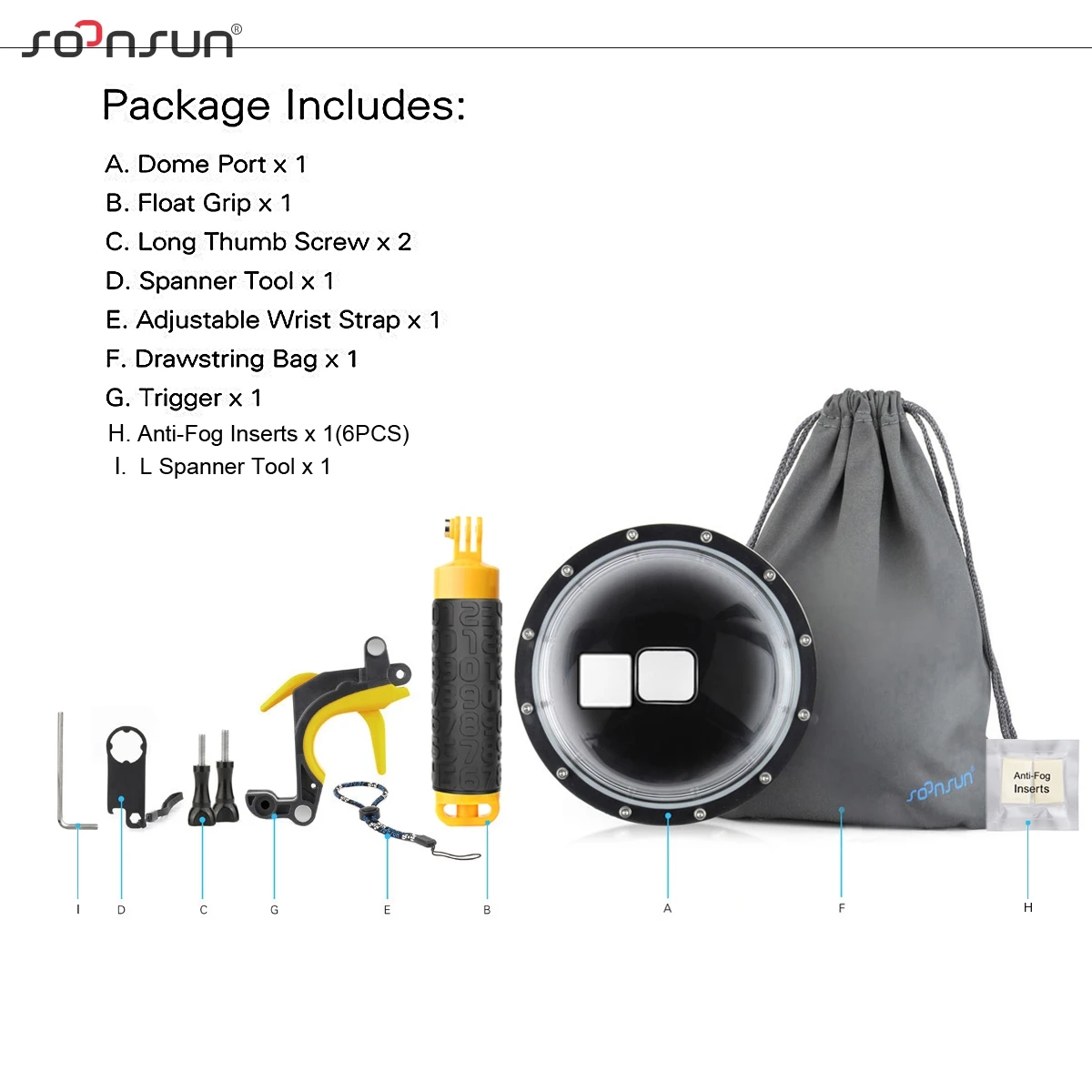 1) Поплавковый полюс: противоскользящий для использования под водой, он съемный и может использоваться отдельно. 2) триггер: функция спуска затвора, легко будет нажать кнопку спуска затвора и его можно использовать отдельно. 3) регулируемый ремешок на запястье: предотвращает падение купольного порта. 4) сумка на шнурке: Легко переносит купол и чистит акриловый купол. 5) гаечный ключ: помогает хорошо затянуть винт. 6) гаечный ключ L: помогает легко снять винты во время чистки купола 7) 6 шт. противотуманных вкладышей: предотвращает запотевание. Используйте в холодной и влажной среде, чтобы избежать избыточной влаги, наполняющей объектив и внутри купольного порта.