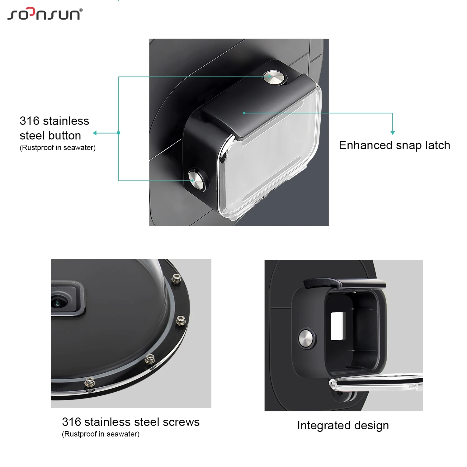 1. Защищены открытое пространство для окна просмотра ЖК-дисплея, удобно проверять режим камеры 2. Усиленный пластиковый корпус, водонепроницаемый до 147ft (45 метров) 3. Полукруглый Купол порт дизайн, толкает линию воды от объектива, увеличить поле зрения выше и ниже линии воды, что позволяет снимать изображения как выше, так и ниже воды одновременно. 3. Сторона основания имеет 12 винтов, съемная конструкция позволяет полностью демонтировать купол для очистки. 4. Кнопка и винт изготовлены из нержавеющей стали 316, нержавеющие в морской воде. 5. Беспроблемная установка, непосредственно подходит для GoPro 9 Black.