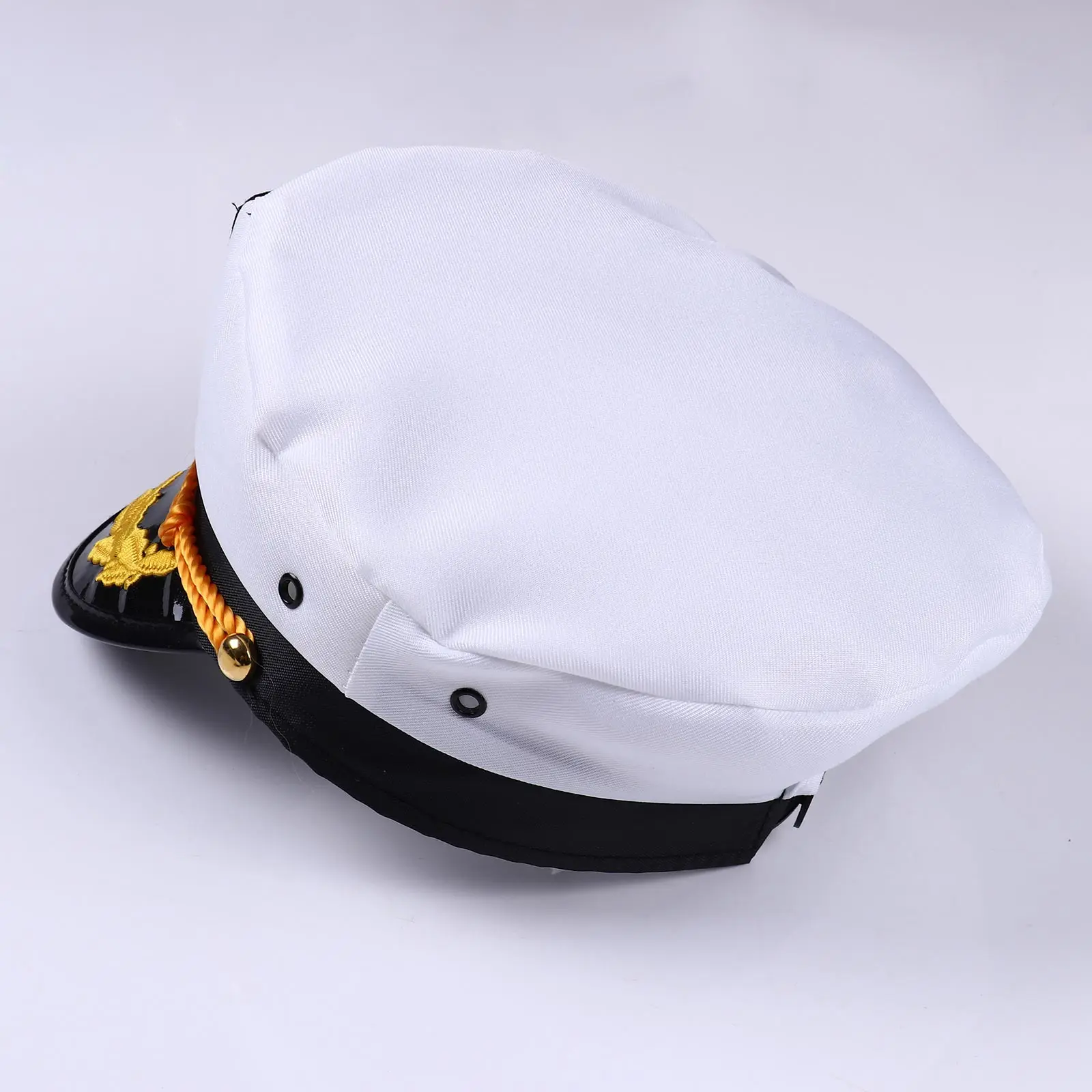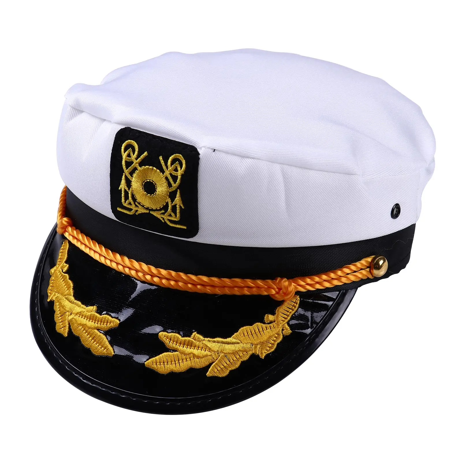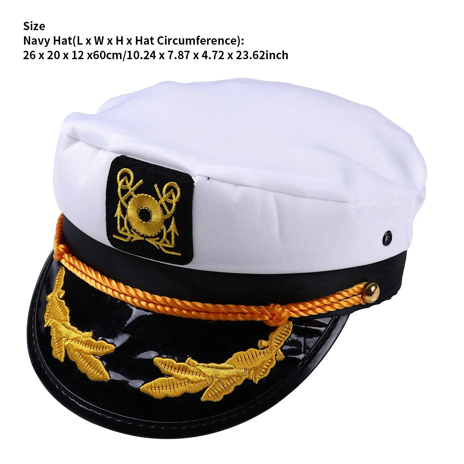 Золотая вышитая морская эмблема и Веревка на краях. Также с небольшим вентиляционным отверстием и задней регулировкой размера.