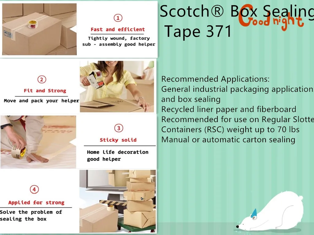 Подробная информация Высокопроизводительная упаковочная лента для тяжелых применений на широком спектре материалов Высокая прочность на разрыв и разделение идеально подходит для электронной коммерции и отправки одной посылки Полипропиленовая подложка с синтетическим резиновым клеем обеспечивает конформируемость под напряжением Легко разматывается и плавно распределяется хорошо работает на высокоскоростных автоматизированных упаковочных линиях Устойчив к истиранию, влаге, химическим веществам и царапинам для длительного использования Отличная адгезия к переработанной лайнерной бумаге и ДВП Скотч®Упаковочная лента 375-это высокопроизводительная упаковочная лента, которая надежно закрывает широкий спектр материалов для тяжелой упаковки, включая переработанный ДВП. Подложка из полипропиленовой пленки легко раскручивается и устойчива к истиранию, влаге и царапинам. Подложка легко соответствует краям и грубым поверхностям для плотного уплотнения. Описание товара Скотч®Упаковочная лента 375-это высокопроизводительная упаковочная лента, используемая для Запечатывание коробок, Сращивание, восстановление и другие требовательные упаковочные приложения. Этот продукт имеет сильную конформируемую подложку и наиболее стабильное давление Чувствительная клеящаяся система горячего расплава. На этот раз проверенная конструкция гарантирует Превосходная производительность в широком диапазоне сред и приложений Улучшенная производительность упаковочной ленты Скотч®Концевая заделочная муфта лента 375 представляет собой 3,1 mil высокопроизводительный Полипропиленовых пленочных упаковочная лента с синтетической резины клеевым соединением, которое обеспечивает надежность даже при напряжения больше или меньше упакованы в коробки. Он специально разработан для гибкости и соответствия под стрессом и идеально подходит для электронной коммерции и отправки одной посылки. Легко раскручивается и поставляется с ручными диспенсерами или 3M-Matic™Чехол-герметик. Эта Лента устойчива к истиранию, влаге, химическим веществам и потере для длительного использования. Рекомендуемые приложения: Приложения для тяжелой упаковки Переработанная бумага и древесно-волокнистая плита Коробки весом до 100 фунтов. Ручное или автоматическое запечатывание коробки Особенности • Чувствительный к давлению термоплавкий каучуковый клей. • Соответствует A-A-1684B CID и ASTM D5486 Type III. • Считается водонепроницаемым согласно ASTM D5570. • Мгновенно прилипает к большинству поверхностей, включая картонные коробки с высоким уровнем Переработанное содержание. • Сильнейшая конформируемая подложка с самым высоким краем разрыва и сопротивления сплит. • Превосходная производительность обеспечивает надежное закрытие. • Отвечает требованиям FDA для непрямого контакта с пищевыми продуктами. Безопасное удержание для тяжелых применений скотча®Упаковочная лента 375 имеет биосно-ориентированную полипропиленовую пленку с чувствительным к давлению резиновым клеем. Он мгновенно и последовательно прилипает к большинству поверхностей, включая коробки, содержащие высокий уровень переработанного содержания. Он предлагает хорошее сопротивление разрыву и расколу и отвечает требованиям FDA для непрямого контакта с пищевыми продуктами. Прочный и надежный Сверхмощная