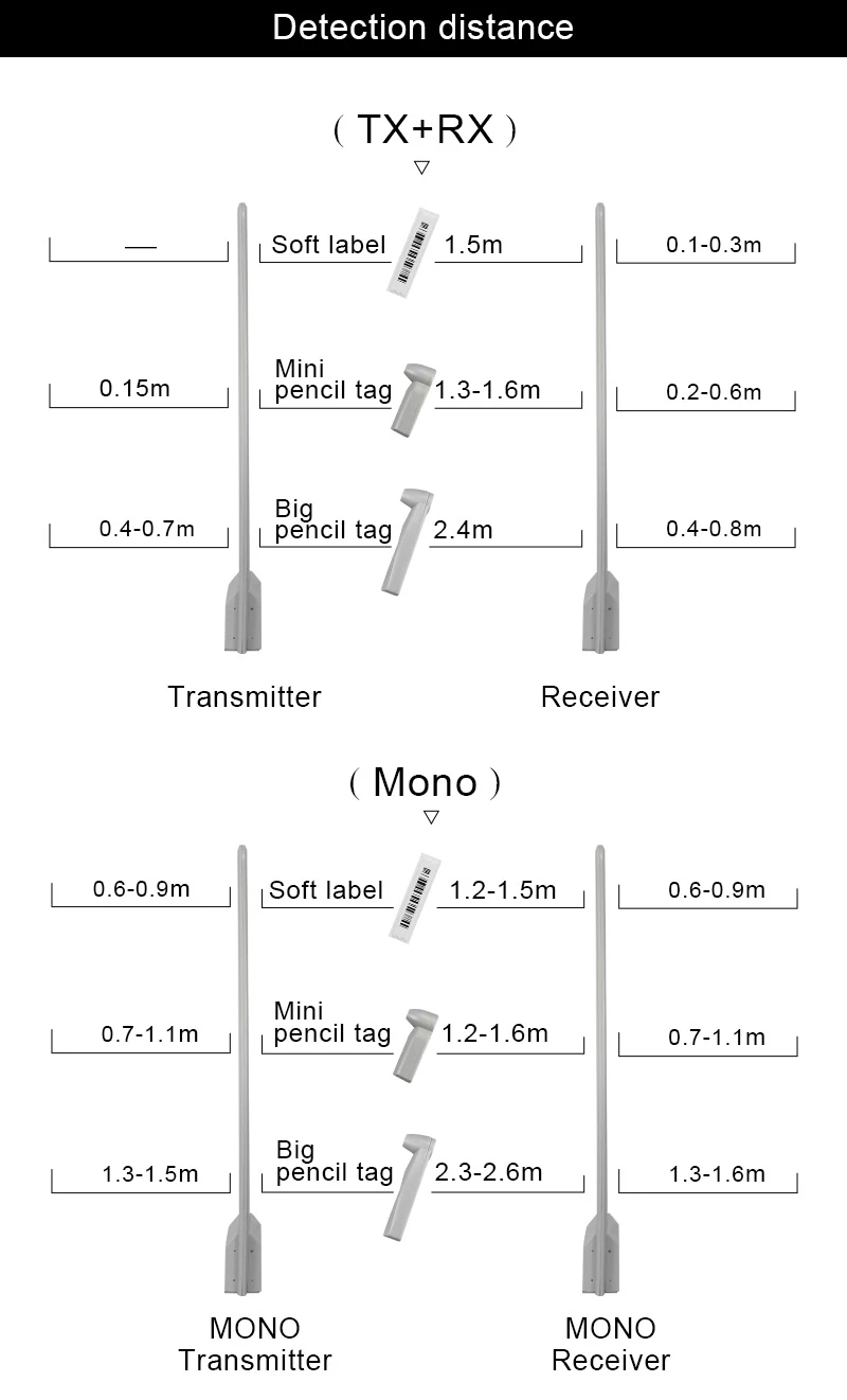 ♦Одна часть антенны может покрывать диапазон обнаружения от0,9 мДо 2,8 м (в зависимости от фактических обстоятельств), самый широкий ряд защиты между двумя антеннами может достигать 1,7 м с мягким DR ярлыки. Не могли бы вы защитите 8,4 м ширина входной двери с тремя антеннами работают одновременно. Он идеально соединен с изысканным украшением торговых центров, легко защищает различные ширины выходов розничных магазинов; Поэтому он подходит для торговых центров.