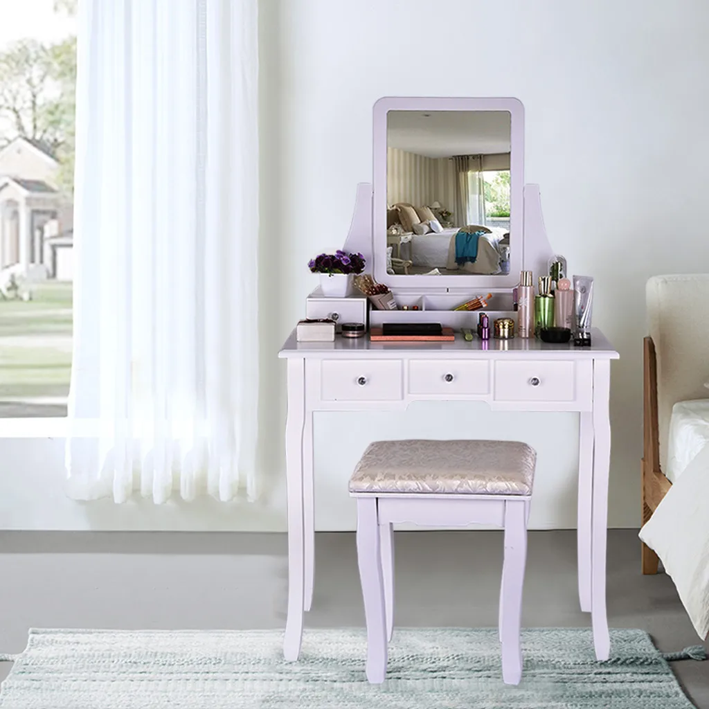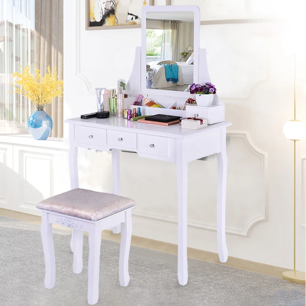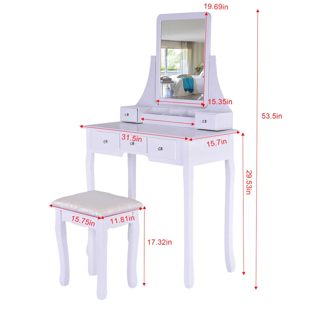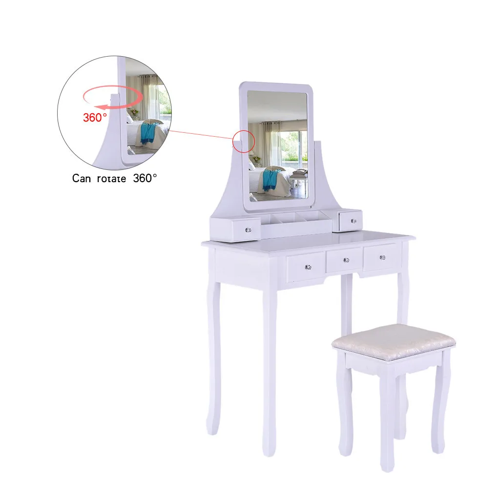 Элегантный и функциональный дизайн: простой и элегантный дизайн с поворотным зеркалом 360 °, кристальной ручкой и деревянными ножками, этот туалетный столик и табурет могут быть функциональным и прочным элементом мебели для вашей спальни, ванная комната, шкаф или прихожая. Мягкое сиденье предлагает Вам удобное место, чтобы сделать макияж и волосы. Этот стол для макияжа станет идеальным подарком для вашей девочки на День святого Валентина, День матери.