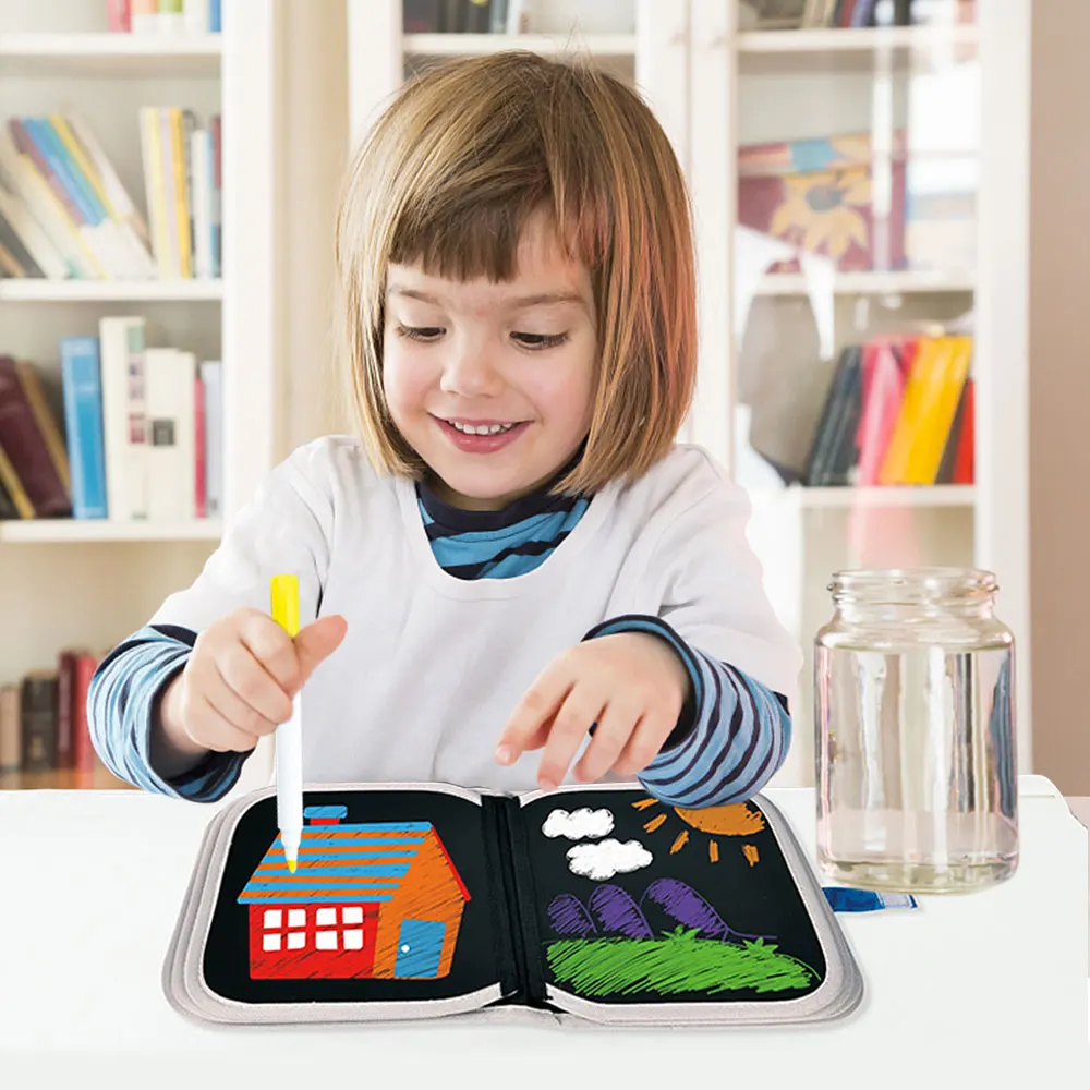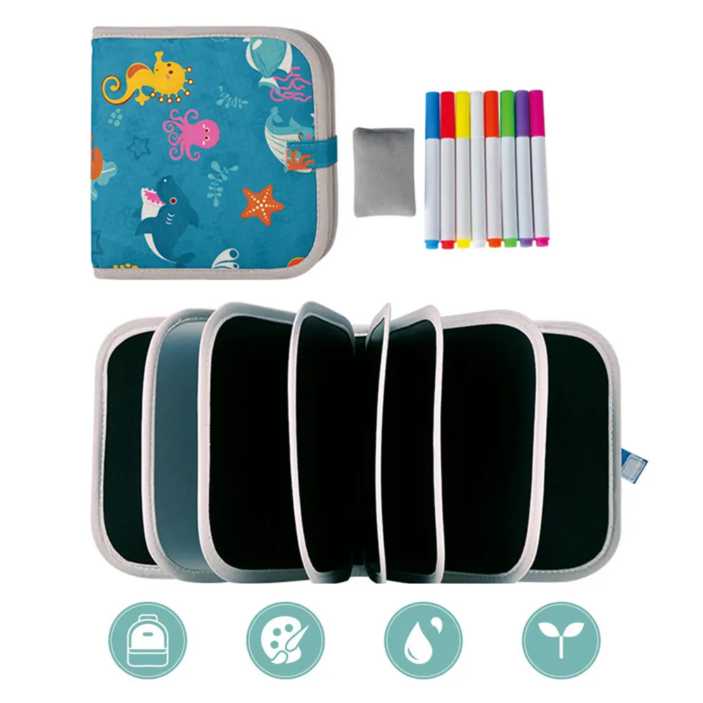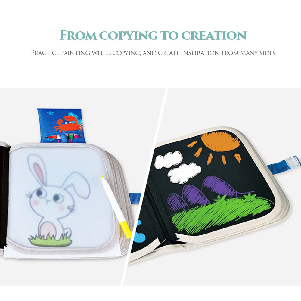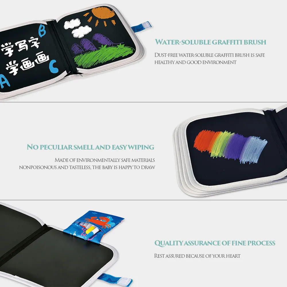 > Водорастворимая Ручка для рисования граффити, без повреждений от пыли. > Прозрачная доска для рисования, скопируйте работу. > Безопасный и экологически чистый материал, нетоксичный и безвкусный, дизайн с закругленными углами, окантовка тканевой ленты. > Тонкое мастерство, водонепроницаемость, не легко рвать, охрана окружающей среды. > Пришейте небольшой тканевый мешок, чтобы упаковать цветные ручки и салфетки в книжку для рисования.