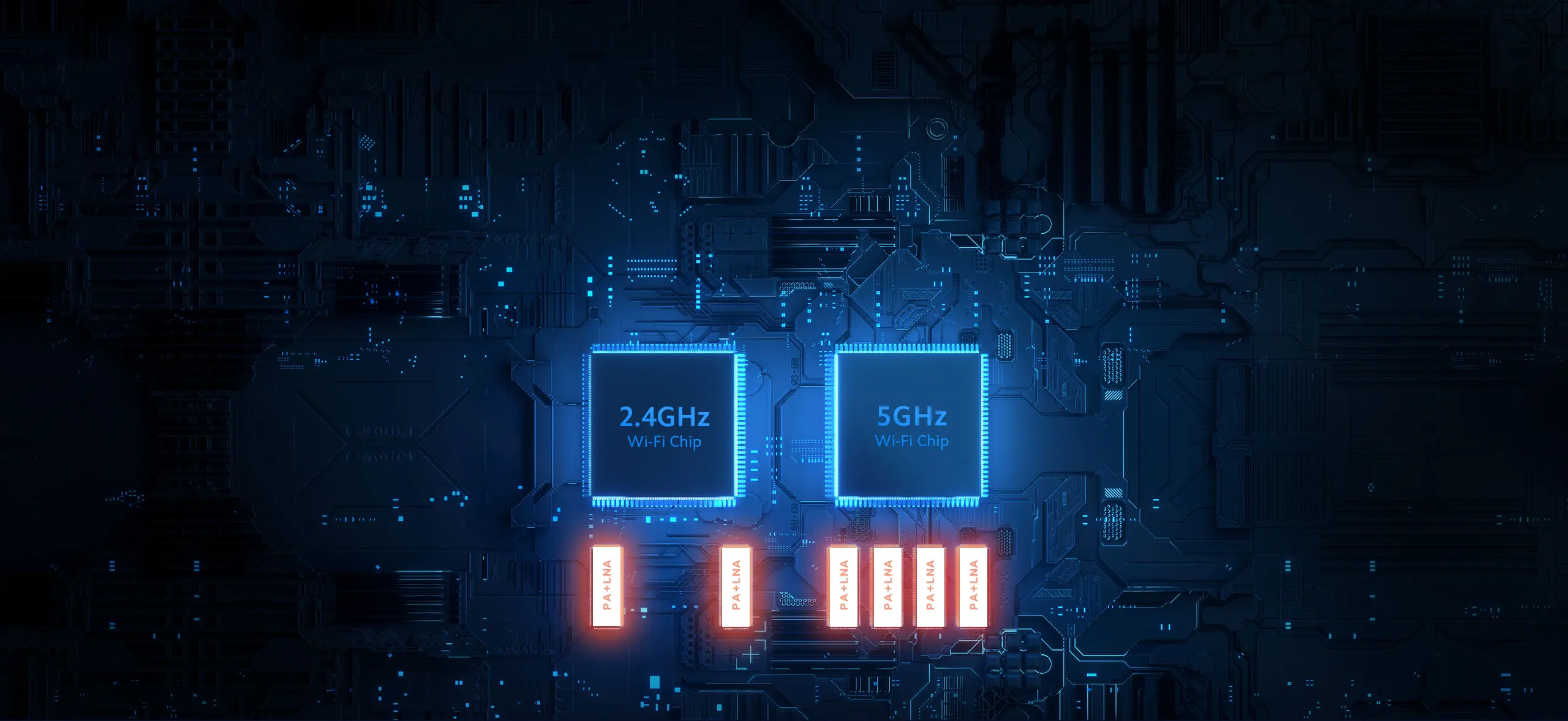 Два и четыре внешних высокопроизводительных усилителя сигнала (PA и LNA) установлены в диапазоне 2,4 ГГц и диапазоне 5 ГГц соответственно. PA (усилитель мощности) эффективно увеличивает мощность передачи сигнала, позволяя маршрутизатору передавать сигналы дальше и сильнее через стены. LNA (малошумный усилитель) повышает чувствительность приема сигнала, позволяя маршрутизатору принимать слабый сигнал дальше.