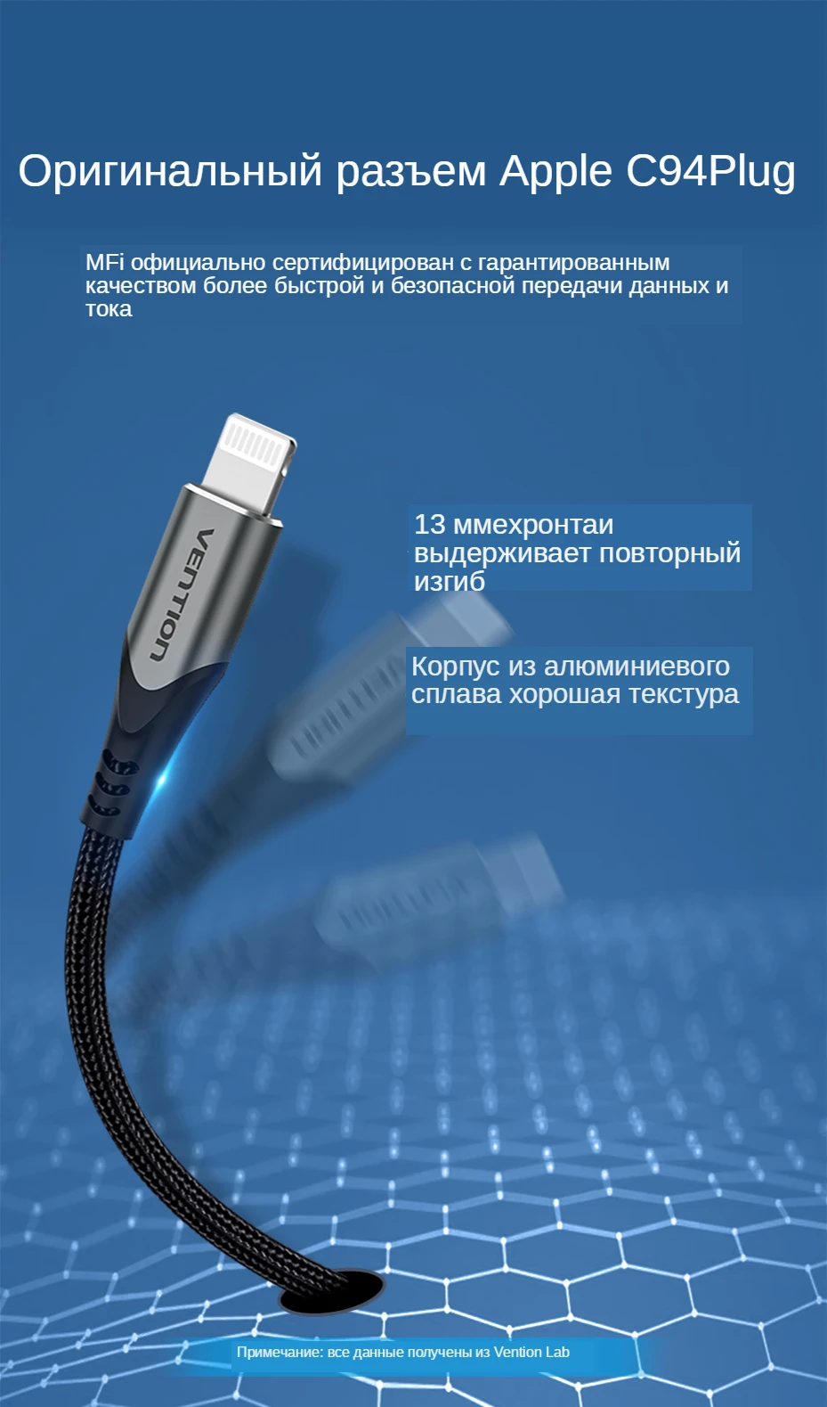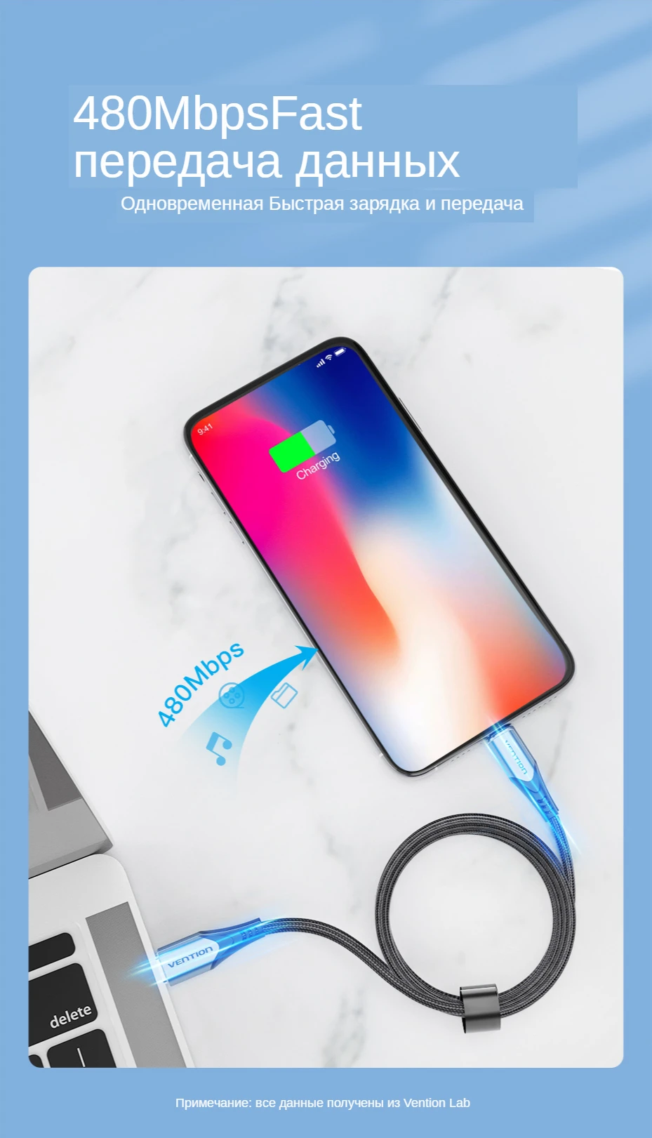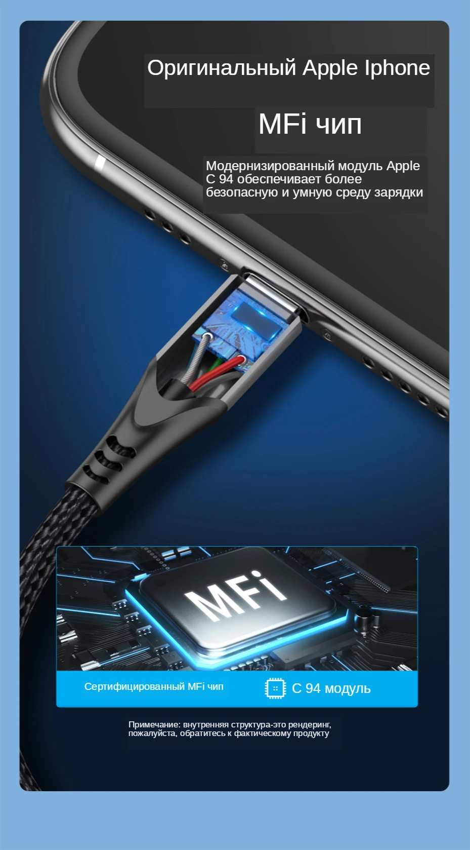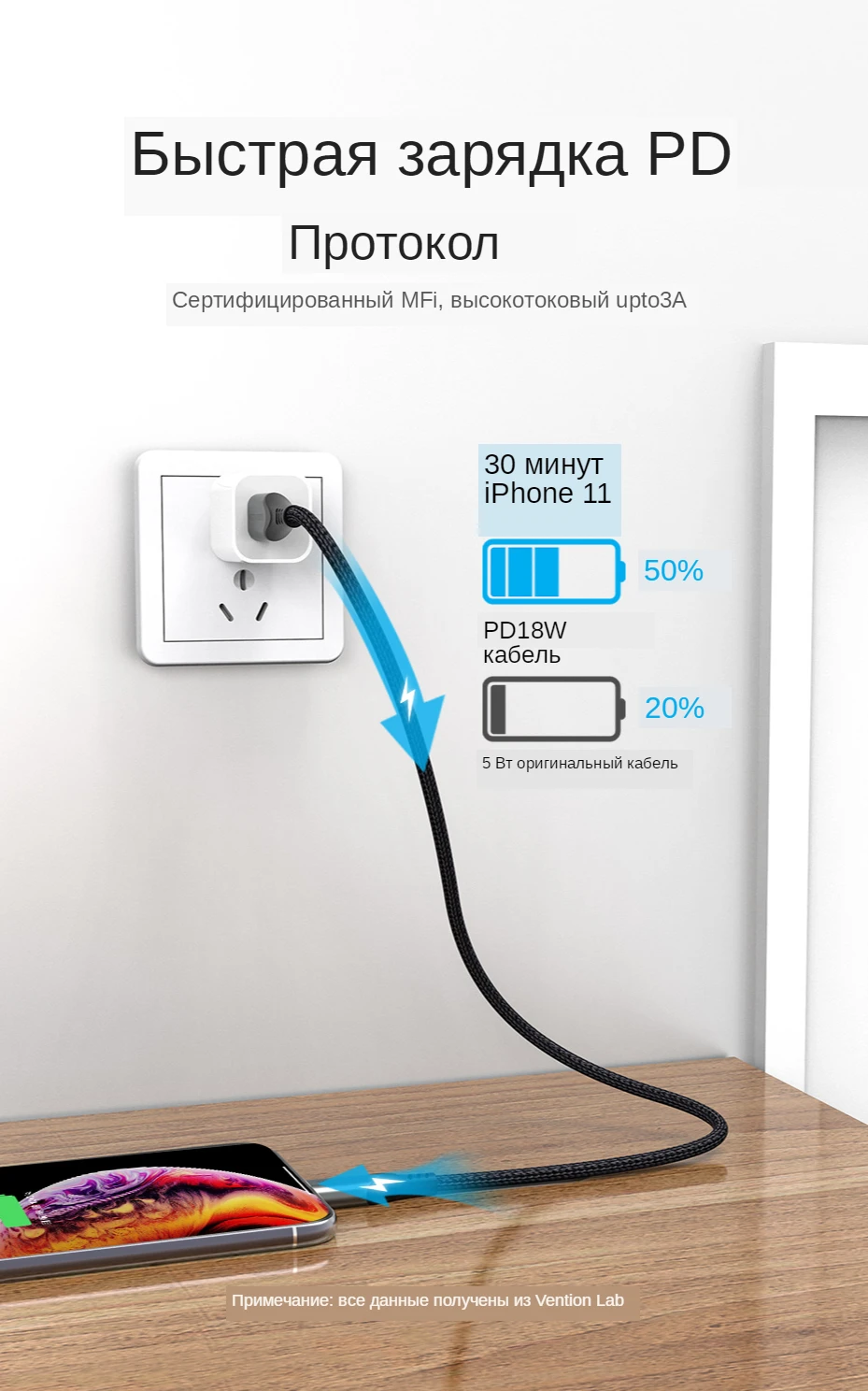 Этот кабель для передачи данных использует новейший разъем C94 lightning, предназначенный для быстрой зарядки, и цвет отличается от предыдущего разъема C48 lightning. Скорость зарядки 2,5 раз быстрее, чем USB кабель с разъемами lightning.