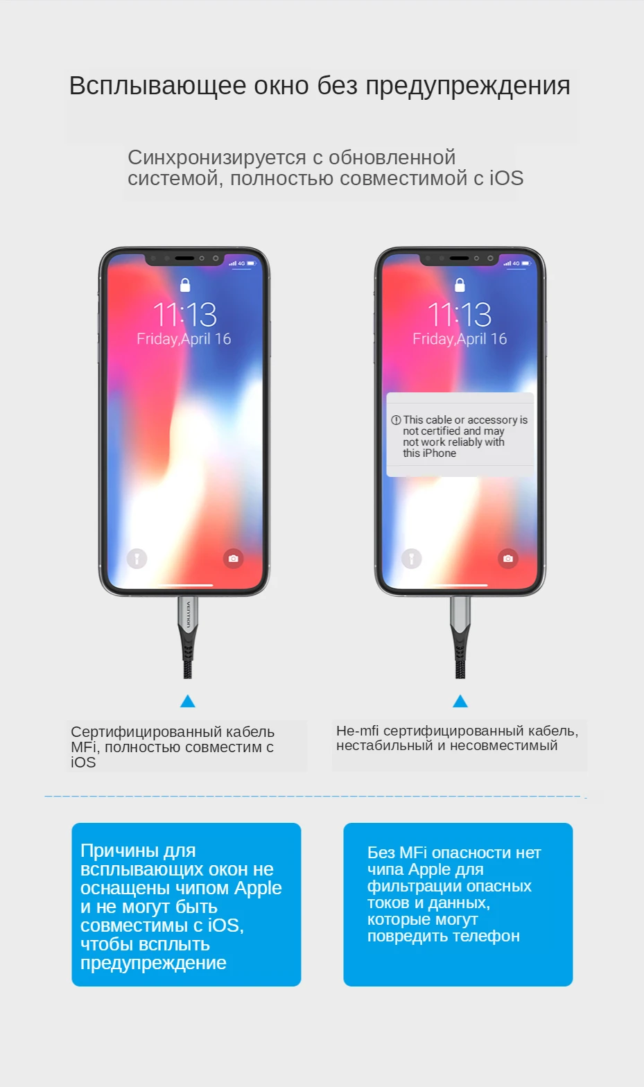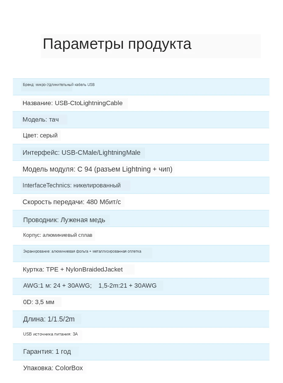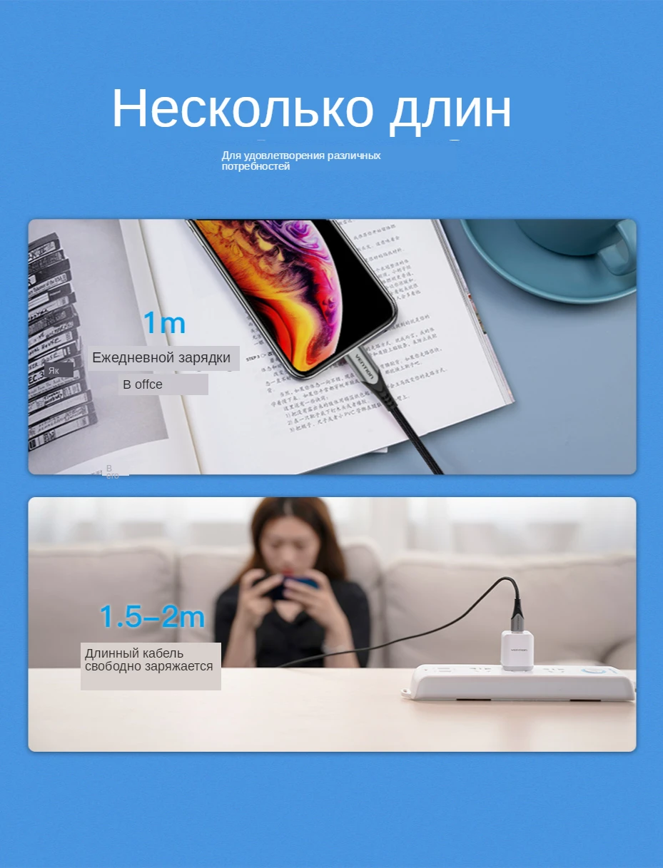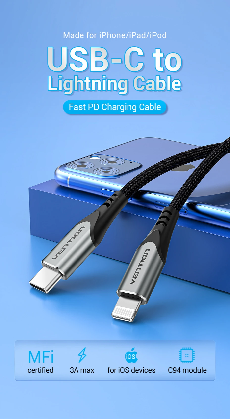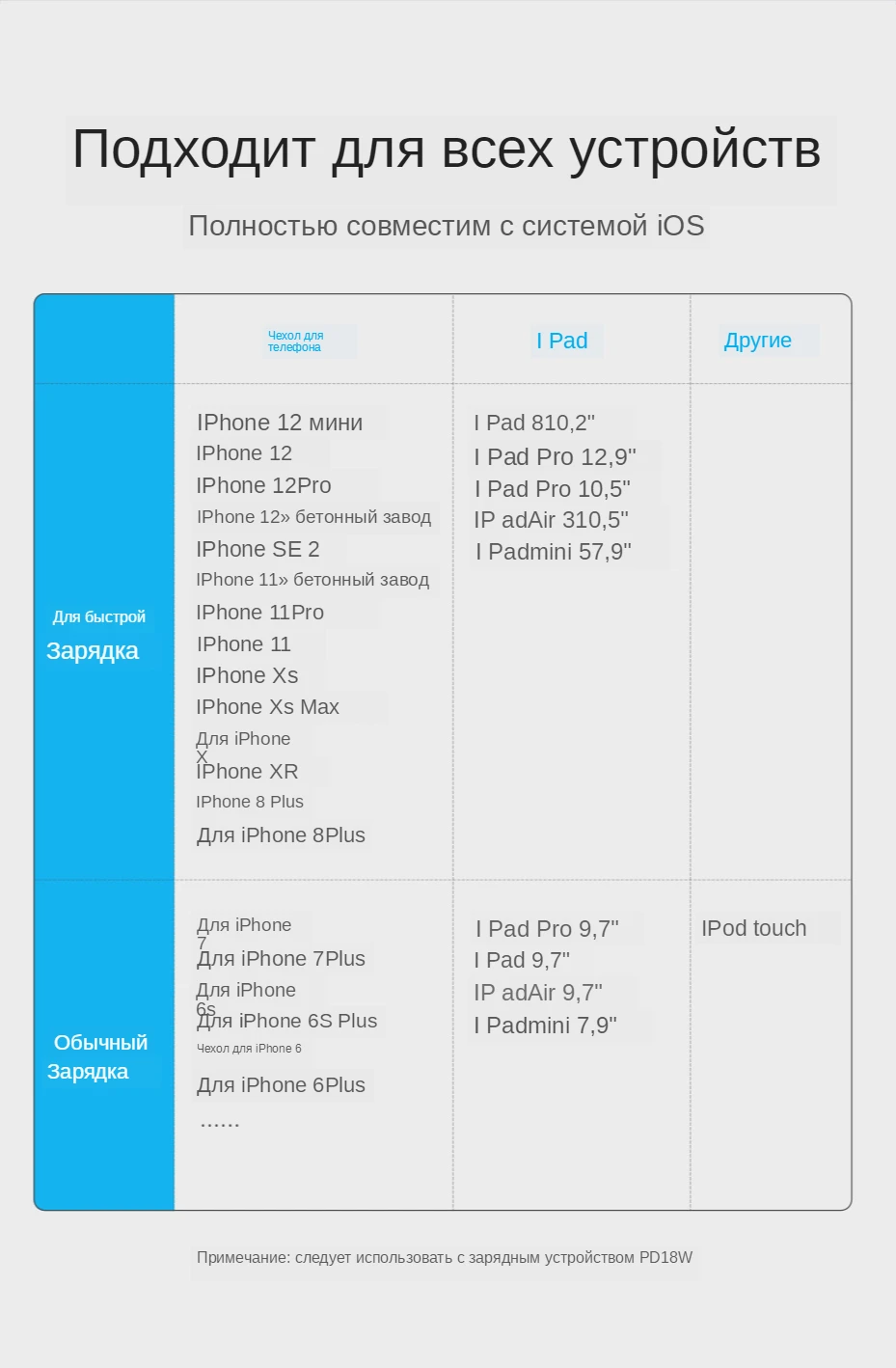 Этот кабель для передачи данных использует новейший разъем C94 lightning, предназначенный для быстрой зарядки, и цвет отличается от предыдущего разъема C48 lightning. Скорость зарядки 2,5 раз быстрее, чем USB кабель с разъемами lightning.
