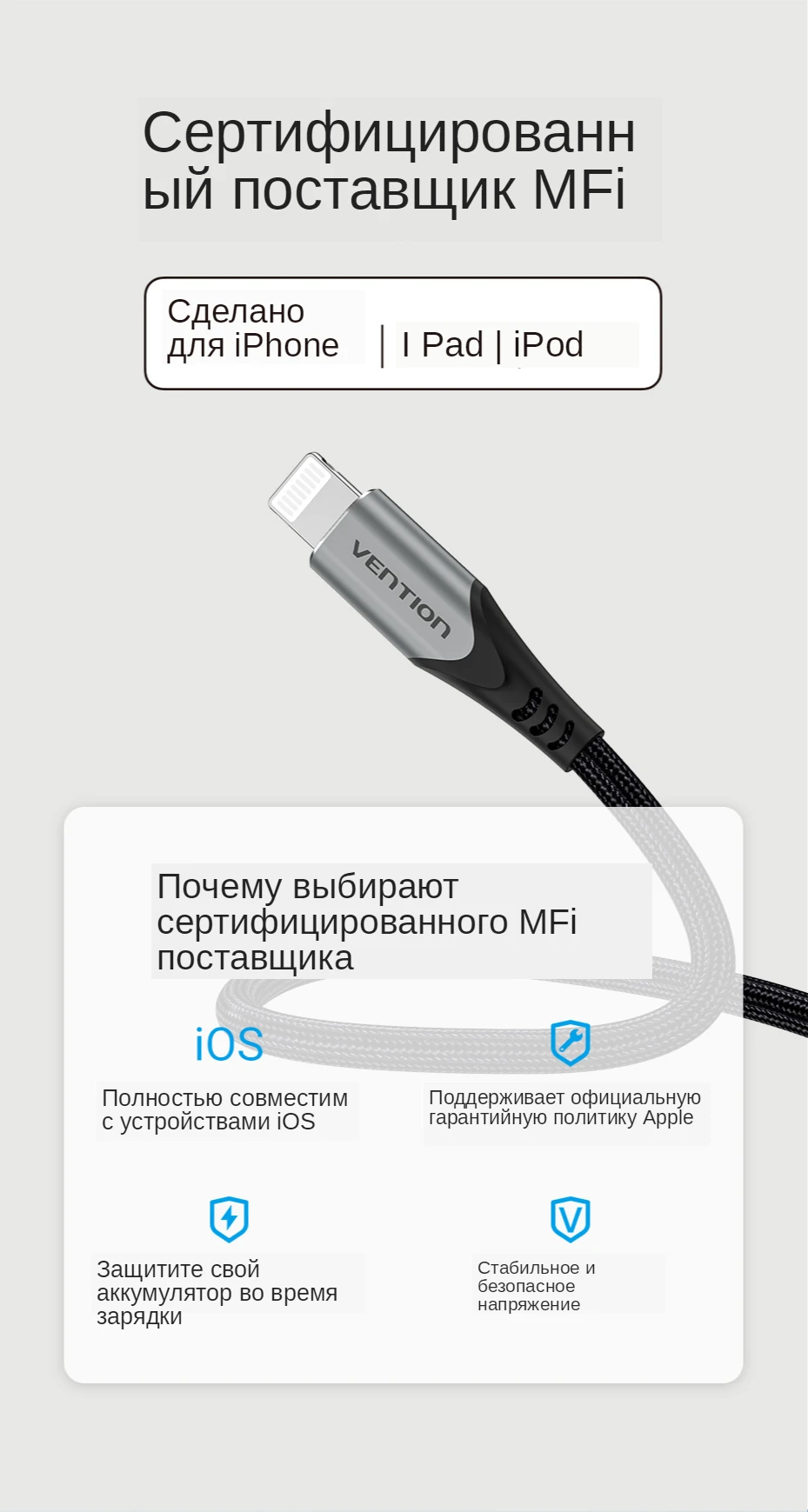 Кабель передачи данных USB C к Lightning выполнил требования к сертификации MFi. Тестирование качества продукции гарантирует безопасность устройств Apple даже при высокой скорости зарядки.