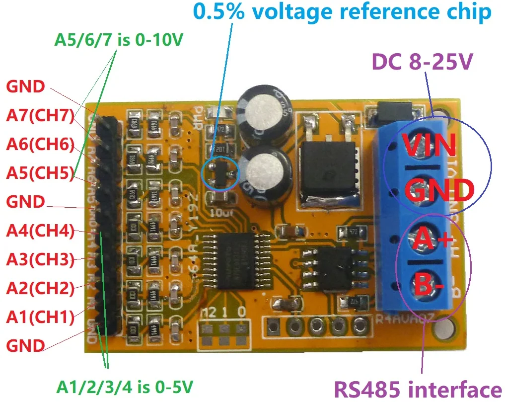 4: Диапазон измерения напряжения A1/2/3/4 канала составляет 0-5 В, а диапазон измерения напряжения A5/6/7 канала-0-10 В. Способность привода проверенного источника напряжения должна быть больше 1 мА, в противном случае измерение не может быть точным (MCU IO напряжение не может быть измерено)